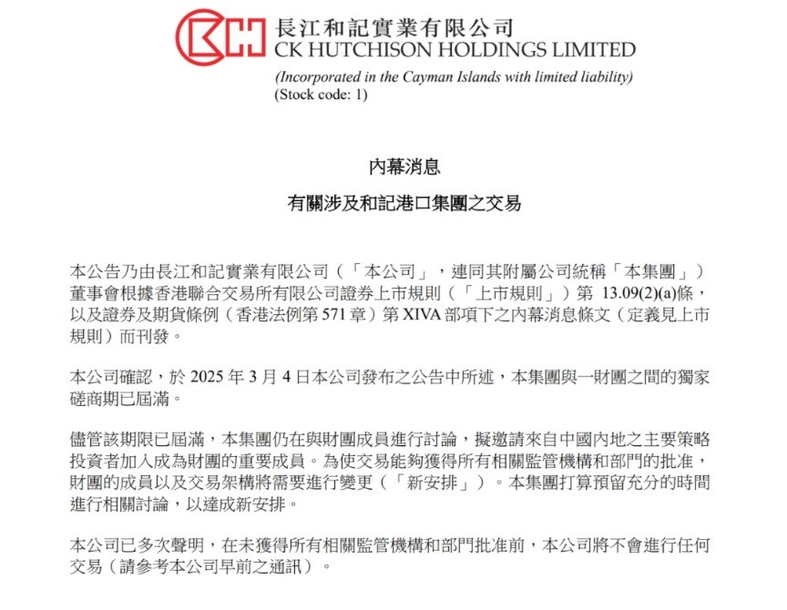 長和公告。 李嘉誠旗下長和今天早上發佈公告:於2025年3月4日發佈公告中所述,集團與一財團之間的獨家商期已屆滿。儘管該期限已屆滿,集團仍在與財團成員進行討論,擬邀請來自中國內地之主要策略投資者加入成為財團的重要成員。 為使交易能够獲得所有相關監管機構和部門的批准,財團的成員以及交易架構將需要進行變更。集團打算預留充分的時間進行相關討論,以達成新安排。 長和表示,公司已多次聲明,在未獲得所有相關監管機構和部門批准前,將不會進行任何交易。 另外,長和提醒,由於無法確定就新安排的討論是否能達成完滿結論,投資者買賣公司證券時務請審慎行事。 今年3月4日,長和公告擬向美國貝萊德牽頭的財團轉讓其持有和運營的,分布於23個國家的43個港口,其中包括巴拿馬運河兩端的港口,總價值228億美元。 5月12日,長和發佈公告稱,原本計劃在5月22日股東周年大會上講述港口交易的情況,但鑒於近日不斷有股東及傳媒查詢,集團現作出以下回應: