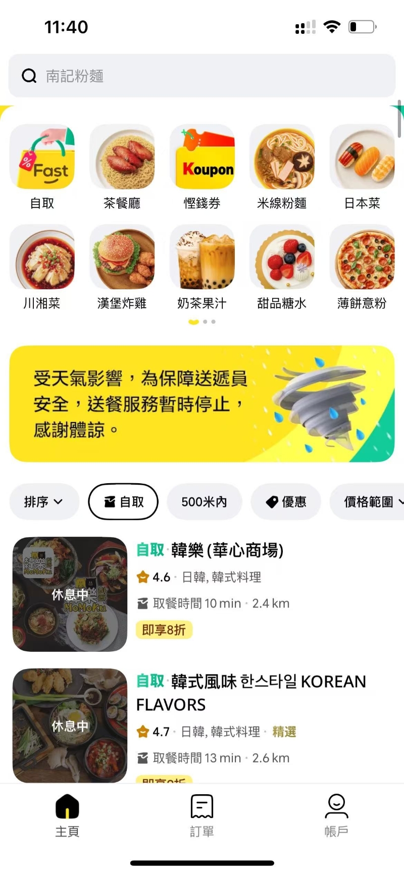 keeta截圖 風暴期間,打開香港常用外賣軟件顯示,受天氣影響,為保障騎手安全,送餐服務暫時停止。即便是選擇自取,大部分餐廳均顯示休息中。但仍有不少市民出門“搵食”,在將軍澳一商場內,記者見到粵菜酒樓等餐廳仍照常營業。在新界一商場內,亦有麥當勞等連鎖餐廳正常營業。