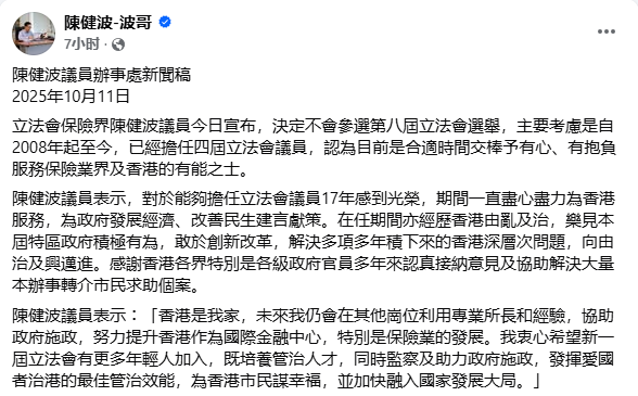 圖源:張宇人fb 71歲的保險界立法會議員陳健波,亦在社交網站宣布不再參選。他表示,自2008年起至今,已擔任四屆立法會議員,認為目前是合適時間,交棒予有心、有抱負,服務保險業界及香港的有能之士。