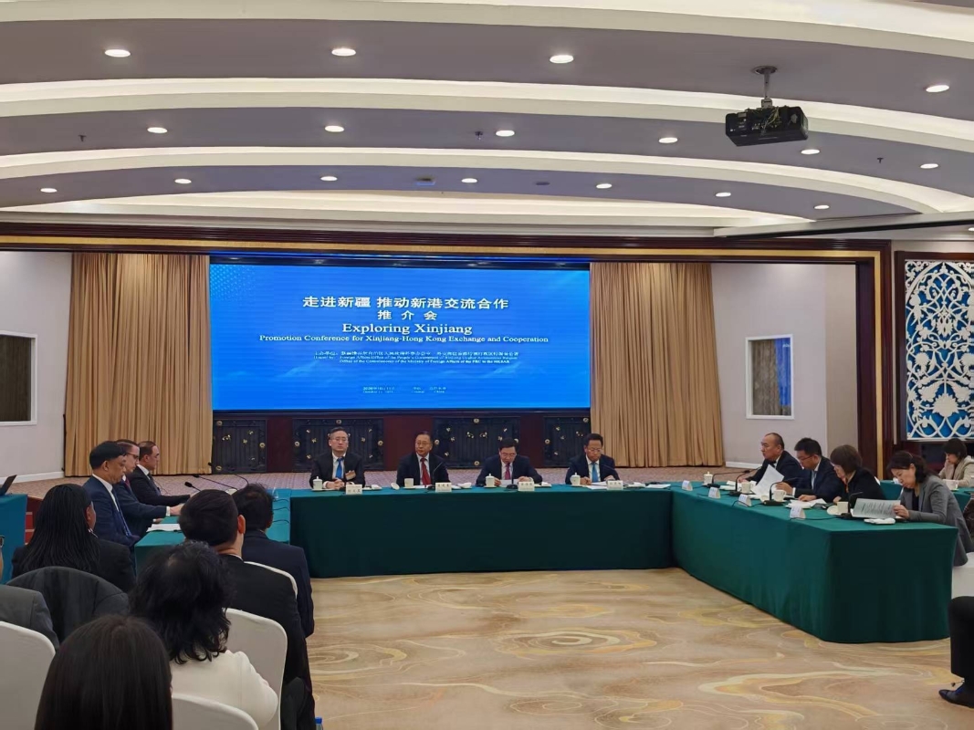 圖源:外交部駐港特派員公署 自治區政府有關部門負責人分別介紹了新疆在“一帶一路”核心區建設、自貿試驗區建設、文旅產業等方面發展成就以及新疆投資營商環境和民族宗教等情況,歡迎各國與新疆加強交往合作。 香港特區政府商務及經濟發展局副局長陳百里、科威特駐港總領事納賽爾、香港瑞士商會聯席主席盛勛文、太古集團公共事務董事唐偉邦在發言中表示,新疆區位優勢明顯,經濟增長潛力巨大,期待與新疆拓展交流合作。
