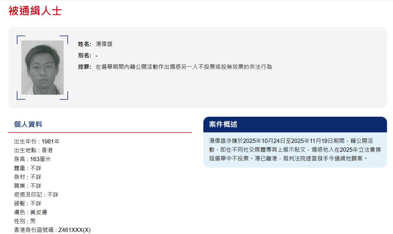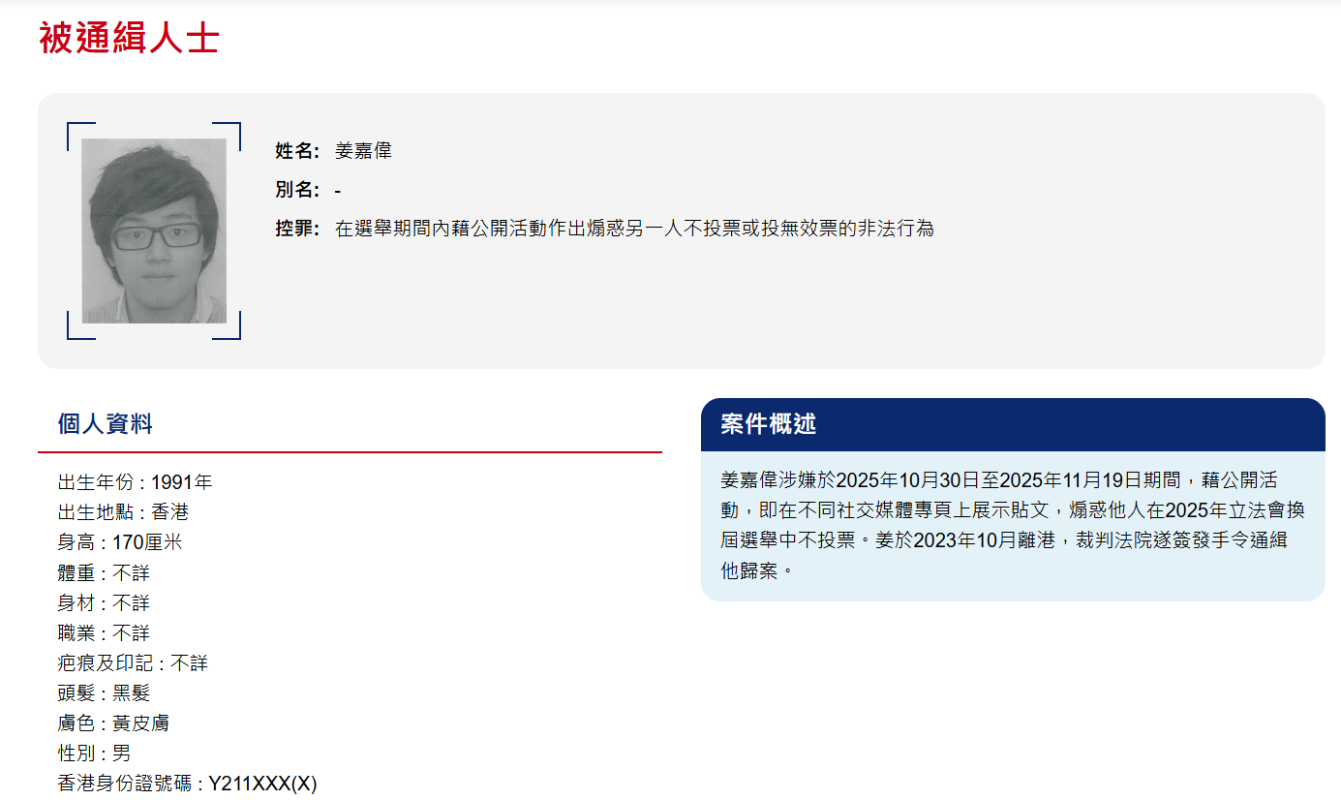 廉署14日以涉嫌觸犯《選舉(舞弊及非法行為)條例》拘捕3名人士。廉署根據律政司法律意見,分3宗案件起訴該3名被捕人士。 3人分別為黃建國,55歲,冷氣工程師;林建栻,66歲,無業;及馬惠鈴,61歲,家庭主婦。他們涉嫌在2025年立法會選舉的選舉期間,各自在其社交媒體專頁上轉載一則煽惑他人在該選舉中不投票的帖文。 被通緝的兩人,則分別為姜嘉偉,34歲;及湯偉雄,44歲,他們各面對兩項控罪,目前已離港。廉署調查顯示,姜嘉偉及湯偉雄曾各自於其社交媒體專頁,發布煽惑他人在2025年立法會選舉中不投票的帖文。 黃建國在其社交媒體專頁轉載姜嘉偉的帖文,而林建栻及馬惠鈴則分別在他們的社交媒體專頁轉載湯偉雄的帖文。(完) 【編輯:譚暢】