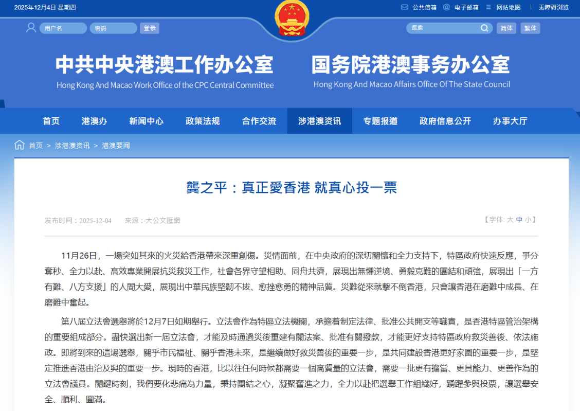 龔之平:真正愛香港 就真心投一票香港新聞網12月4日電 中共中央港澳工作辦公室、國務院港澳事務辦公室網站4日轉發題為《龔之平:真正愛香港 就真心投一票》的港媒文章,全文如下:
