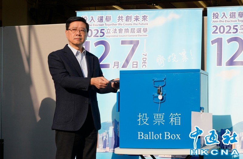 香港行政長官李家超到高主教書院投票站投票。(陳奕啟 攝)