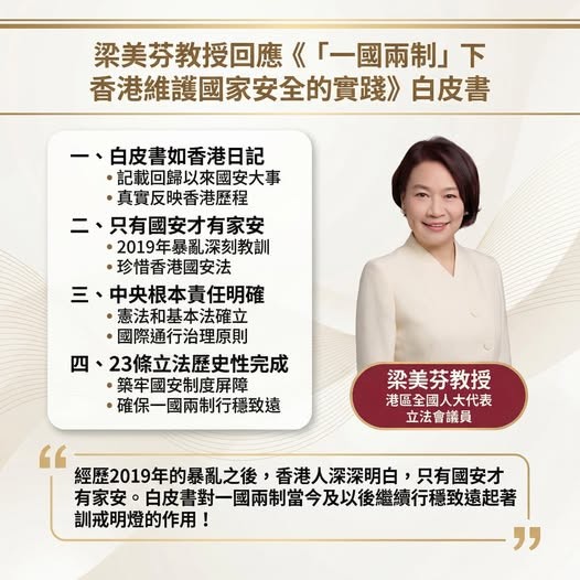香港新聞網2月10日電 國務院新聞辦公室10日發布《“一國兩制”下香港維護國家安全的實踐》白皮書。港區全國人大代表、香港基本法委員會委員、立法會議員梁美芬表示,白皮書就像回歸以來的一本日記,記載香港回歸以來每一件就國家安全出現的大事表。對於過去30年一直專注在基本法及一國兩制在香港的落實情況的我,閱讀白皮書,猶如看到香港的日記一樣如此真實。一幕一幕就國家安全立法以致香港出現威脅國家安全的種種事件及暴亂,都是如此真實,對一國兩制當今及以後繼續行穩致遠起着訓戒明燈的作用!