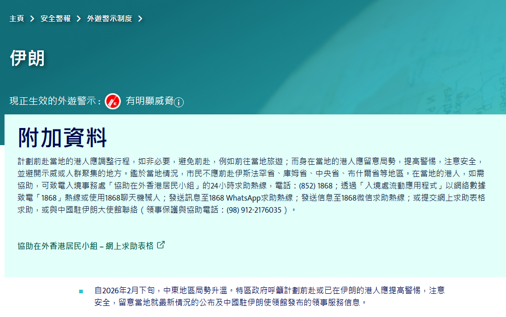 香港新聞網2月28日電 就伊朗及以色列最新局勢,香港入境處28日表示,已即時透過外交部駐香港特別行政區特派員公署、中國駐伊朗伊斯蘭共和國大使館、中國駐以色列大使館及旅遊業監管局了解情況,至今未有接獲港人求助。