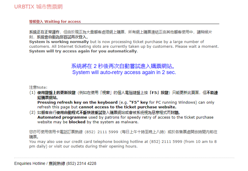 在開票正點嘗試購票,網頁畫面就顯示由於現正為大量顧客處理網上購票,所有網上購票連結正由其他顧客使用中,需稍候片刻。開票半個小時,刷新網站數十次後終於進入購票頁面,其中羽毛球、擊劍、體操及乒乓球示範表演場次僅餘少量票但始終因系統繁忙無法付款買票。 【編輯:刘春】