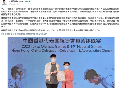 香港中通社圖片 香港特區行政長官林鄭月娥、民政事務局局長徐英偉及校監林大輝等擔任嘉賓。 張家朗獲母校林大輝中學頒發約250萬港元獎金,以表揚他為香港體壇做出的貢獻。此外,林大輝中學將兩個課室分別以張家朗,以及獲得東奧女子空手道個人形項目銅牌的劉慕裳命名。 林鄭月娥致辭時表示,教育局近日推出試行版的“價值觀教育課程架構”,當中很多價值觀都在體育中體現,例如堅毅、尊重他人、國民身分認同、承擔精神、勤勞等,精英運動員站上頒獎台,國歌奏起、區旗升起之時,國民身分認同應是油然而生。她說,體育發展不單是爭奪獎牌,更有深層的意義,希望體育界繼續努力。 林大輝中學過去17個學年培育了不少香港體壇精英,除在東京奥運摘牌的奥運花劍金牌張家朗和奧運女子空手道個人形項目銅牌劉慕裳外,還有世界單車冠軍郭灝霆、“乒乓一哥”黃鎮廷、亞運獎牌得主歐倩瑩、崔浩然、楊子加、廖文希及方凱申等人。 【編輯:张琦】