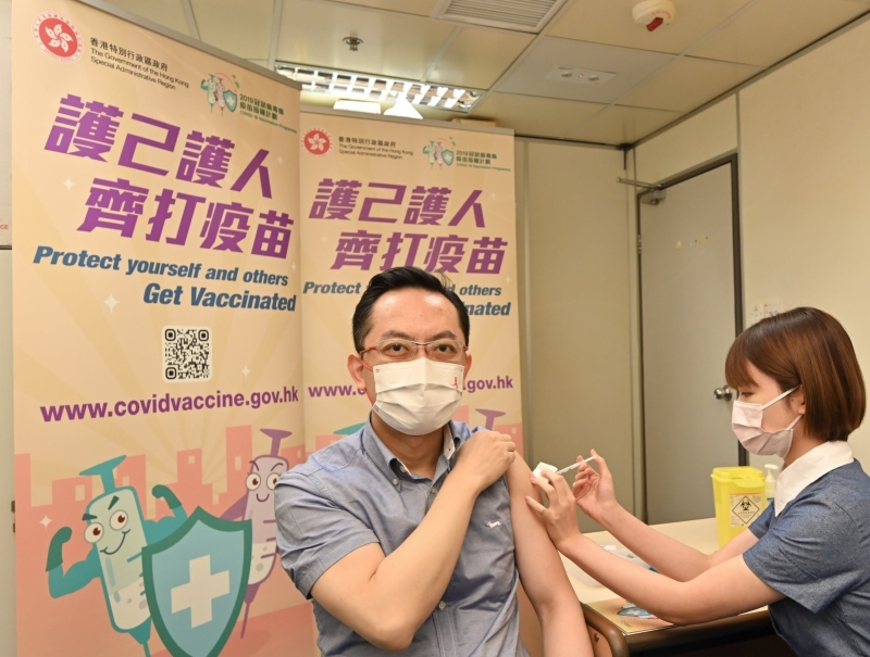 香港衞生署署長林文健今日(2日)聯同多名衞生署服務主管,於衞生署診所接種第三劑新冠疫苗(克爾來福),並呼籲尚未接種第一、二劑疫苗的市民盡快接種,護己護人。