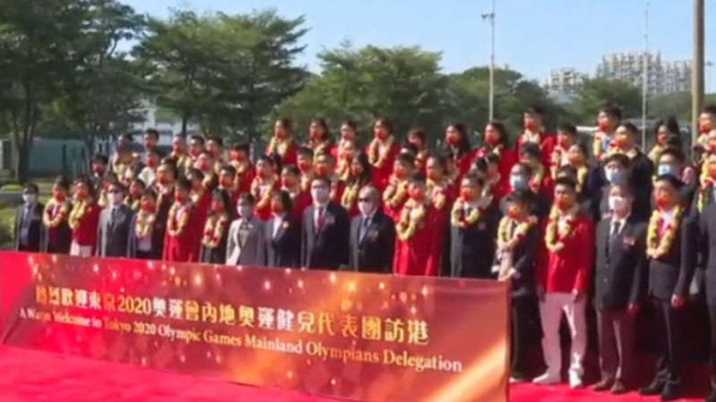 29名出戰東京奧運會的國家運動員及3名教練,今日(3日)下午經深圳灣抵達香港。香港特區政府民政事務局長徐英偉、康樂及文化事務署署長劉明光、中央人民政府駐香港特別行政區聯絡辦公室宣傳文體部副部長鄭琳、港協暨奧委會會長霍震霆到口岸迎接。