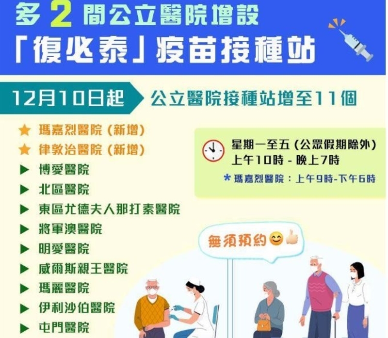 接種站服務時間:星期一至五(公眾假期除外),上午10時至晚上7時(瑪嘉烈醫院接種站上午9時至下午6時開放)。