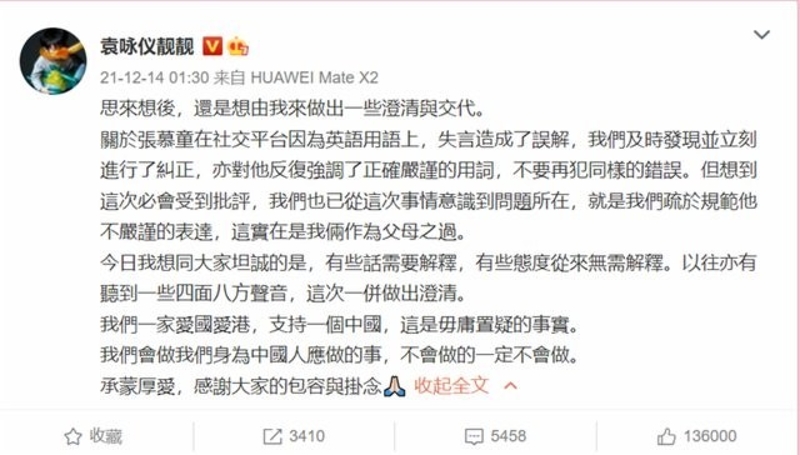 有網友在微博指稱,香港藝人張智霖與袁詠儀兒子“魔童”(張慕童)“好像是港獨”。原因是有人在社交媒體Instagram上問他在不在中國,他發了個香港的圖片當背景卻說自己不在中國。 袁詠儀表示,關於張慕童在社交平台因為英語用語上,失言造成了誤解,我們及時發現並立刻進行了糾正,亦對他反覆強調了正確嚴謹的用詞,不要再犯同樣的錯誤。但想到這次必會受到批評,我們也已從這次事情意識到問題所在,就是我們疏於規範他不嚴謹的表達,這實在是我倆作為父母之過。 袁詠儀說,今日我想同大家坦誠的是,有些話需要解釋,有些態度從來無需解釋。以往亦有聽到一些四面八方聲音,這次一併作出澄清。“我們一家愛國愛港,支持一個中國,這是毋庸置疑的事實。”“我們會做我們身為中國人應做的事,不會做的一定不會做。” 【編輯:李冉】
