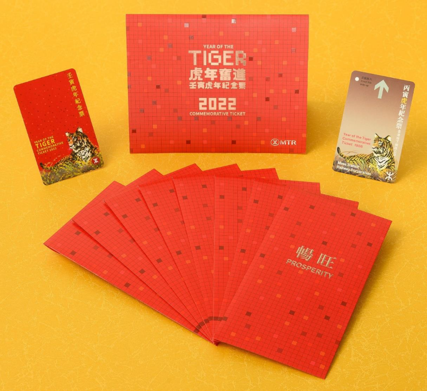 香港新聞網1月10日電 港鐵今日(10日)宣布,為慶祝壬寅虎年來臨,推出限量版“虎年賀年車票”套裝,每套車票套裝售價為港幣100元,內含2張車票、一個票套和8個紅色利是封,將於本周六(15日)公開發售。