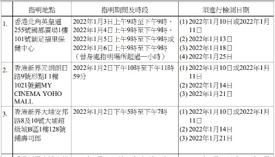 香港新聞網1月12日電 視疫情發展及防控需要,香港特區政府1月12日劃出受限區域並發出檢測及限制宣告。曾於過去14日內身處受限區域內任何處所逾2小時的所有人士,均須接受強制檢測,其中包括沙田新城市廣場、銅鑼灣崇光百貨等。 因應1宗與輸入個案有流行病學關連的個案,以及6宗初步陽性檢測個案,以下31個指明地點被納入強制檢測公告。