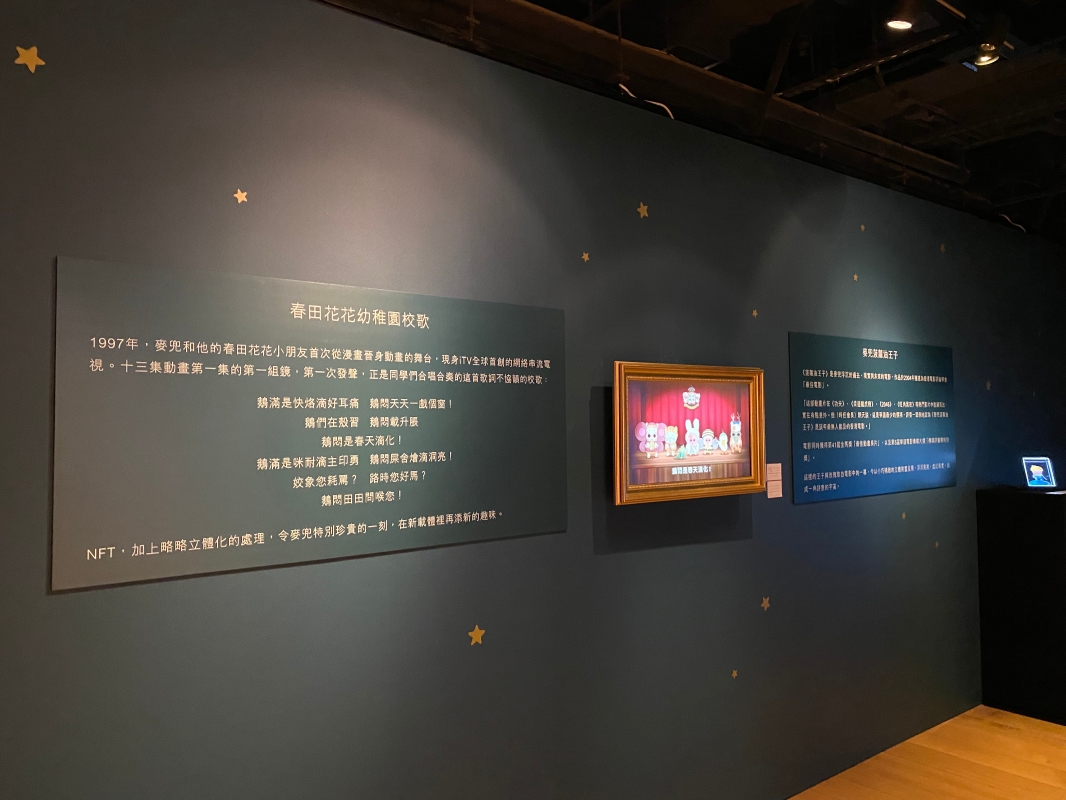 《魚蛋粗》 進門左方,懸掛著“麥兜”系列臨摹各種字體的“春”字,具有濃郁的中國新年氣氛。牆上錯落展示“麥兜”漫畫畫作。左側展廳盡頭為NFT技術加上立體化處理的顯示屏,循環播放《春田花花幼稚園校歌》。