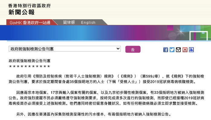 香港新聞網1月20日電 香港特區政府今日(20日)凌晨刊憲,因應1宗本地個案、2宗與輸入個案有關的個案,以及10宗初步陽性檢測個案,有39個指明地方被納入強制檢測公告,於指定期間曾身處指明地方的人士,需接受新冠病毒強制檢測。