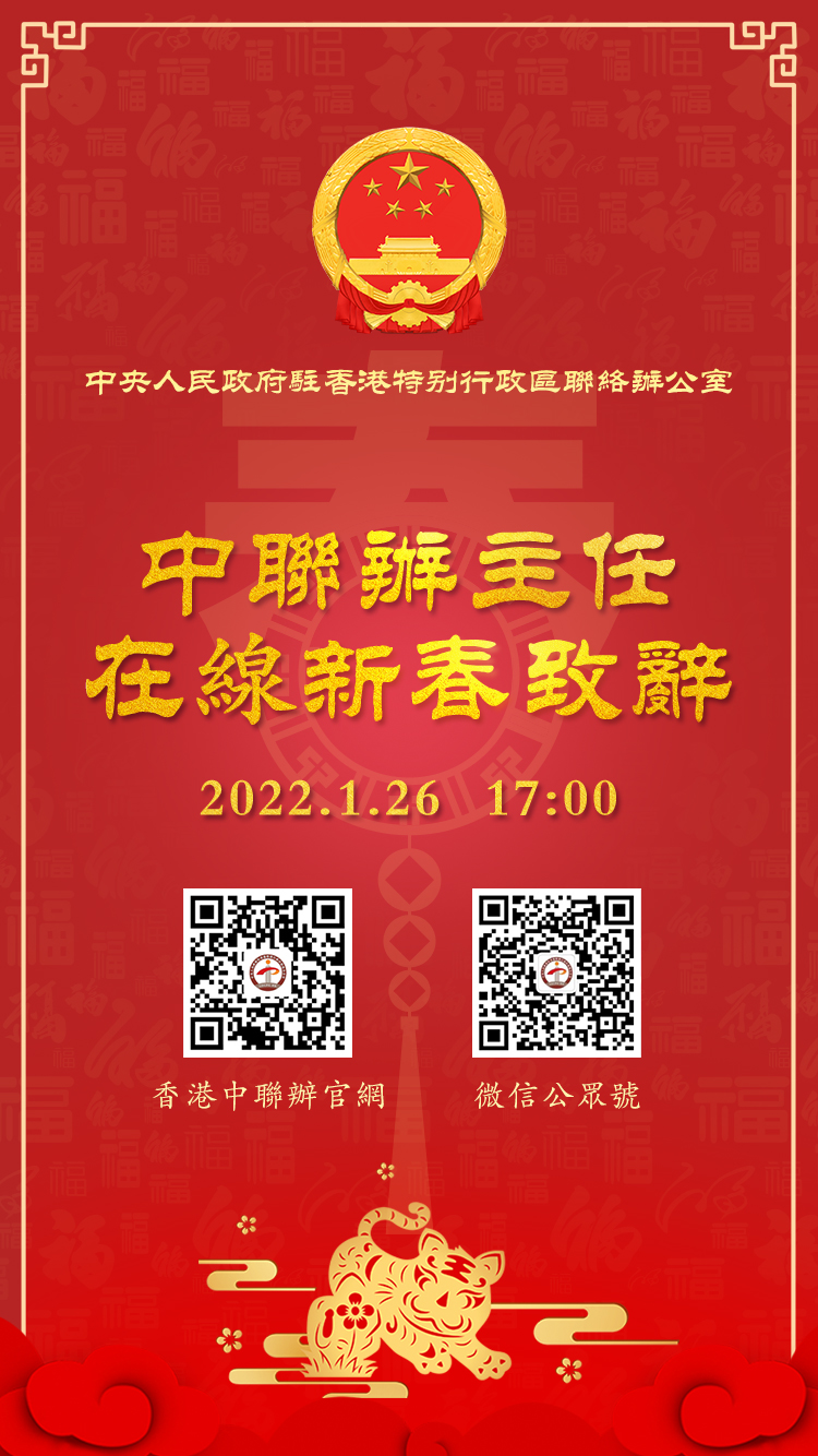 香港新聞網1月25日電 1月26日17時,中央政府駐港聯絡辦主任駱惠寧將在線發表新春致辭,與廣大香港同胞共迎虎年新春。屆時,香港中聯辦官網和微信公眾號將進行直播。