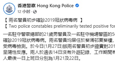 香港新聞網1月30日電 香港警方29日表示,一名駐守尖沙咀分區的46歲男警員初步確診新冠病毒。他居住於葵涌邨映葵樓,獲安排接受病毒檢測,今日初步證實呈陽性反應。他於過去14日沒有外遊記錄,工作期間有佩戴口罩,最後上班日為1月20日。