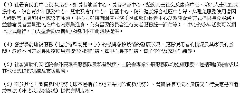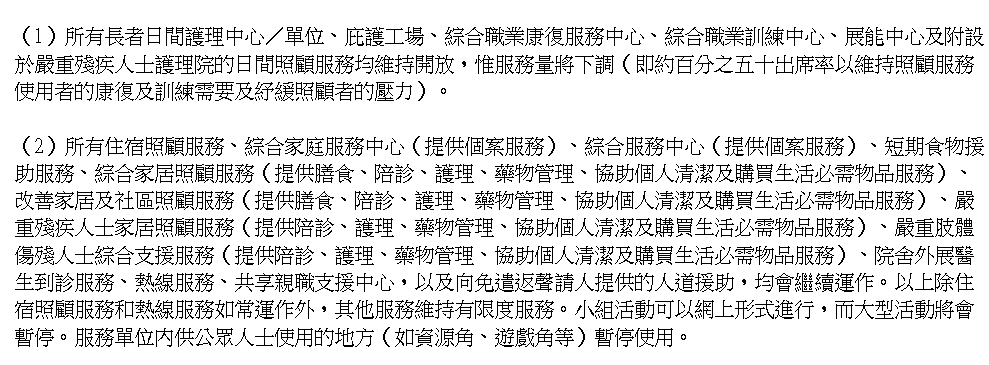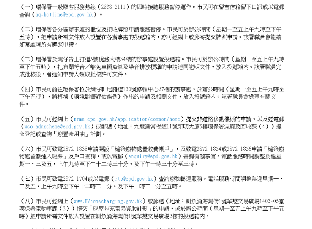香港新聞網2月4日電 香港特區政府4日起擴大特別上班安排,除提供緊急必須服務和參與防疫抗疫人員外,其他政府僱員盡量在家辦公,有關安排暫定實行至本月11日。香港新聞網整理各部門最新安排供市民了解。 香港海關 除於各仍然開放的出入境管制站維持正常清關服務外,北角渣華道海關總部大樓三樓顧客服務中心和九龍灣南豐商業中心12樓金錢服務監理科辦事處,由4至11日(星期六、日除外)期間將如常開放,便利市民及業界業務運作。 教育局 各區的區域教育服務處、幼稚園及幼兒中心聯合辦事處4日起只提供緊急和必須的公共服務,以及與防疫抗疫有關的工作。有關安排暫定實行至11日。 香港郵政 香港郵政總局及尖沙咀郵政局將於5日維持正常開門時間,但會提早於下午一時關閉。郵政總局將於6日暫停服務。其他郵政局營業時間不變。 香港屋宇署 屋宇署由4日起至11日會繼續為市民提供緊急和必須的公共服務,有關服務主要處理公眾就樓宇安全及正在建造的僭建物的舉報、新發展項目的法定申請、承建商的註冊事宜、為發牌機構提供諮詢服務,以及推行樓宇更新大行動2.0的相關工作。 香港勞工處 勞工處由4日起只提供緊急和必須公共服務,有關安排暫定實行至11日。勞資關係科轄下各分區辦事處及職業介紹所事務科會於星期一、三及五提供有限度櫃位服務,至於專門解答居於葵涌邨的僱員就疫情下所遇到僱傭權益問題的查詢熱線將維持星期一至五辦公時間服務,勞工處的其他櫃位服務則會暫停。 稅務局 稅務局由4日起只提供必須的公共服務,中央詢問處、商業登記署和印花稅署,辦公時間為星期一至五上午9時至中午12時,以及下午1時30分至4時。 中央詢問處只限有關離港人士清繳稅項的查詢。中央電話查詢處辦公時間則為星期一至五早上9時至下午12時半,以及下午1時半至4時。 環保署