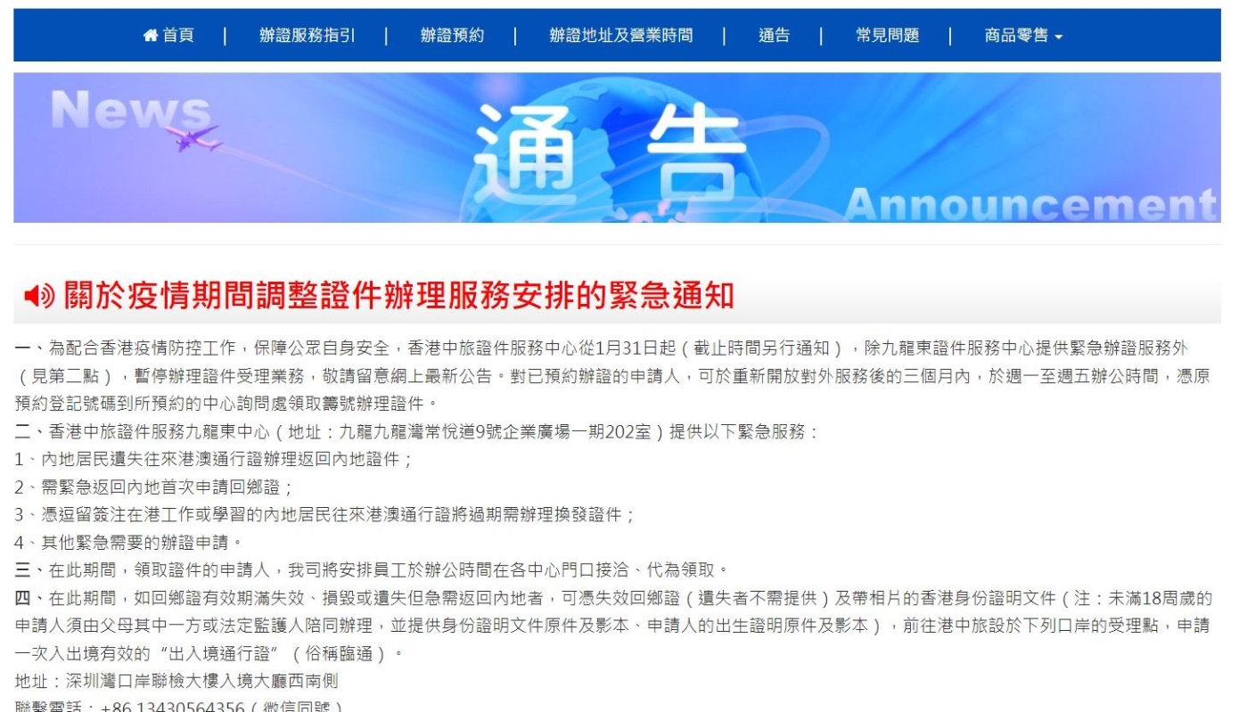 香港中通社圖片 自新冠疫情以來,在港工作的“港漂”陳小姐已經兩年沒有回鄉,今年的春節回鄉夢又落空,眼看當前疫情持續惡化,在短期“通關”無望下,她最終選擇辭職回鄉。 陳小姐告訴香港中通社記者,即使家鄉江蘇省隔離政策嚴格也不想再等了,但辭了職準備回鄉時才發現通行證已過期。 按照有關規定,通行證過期是可以到香港中旅社補辦,但陳小姐發現因疫情太嚴重,香港中旅社已暫停營業,由於不知道如何補辦證件,目前她仍然停留香港。 記者翻查香港中旅社網頁顯示,為配合香港疫情防控工作,保障公眾自身安全,香港中旅證件服務中心從1月31日起,除九龍東證件服務中心提供緊急辦證服務外,暫停辦理證件受理業務,直至另行通知。