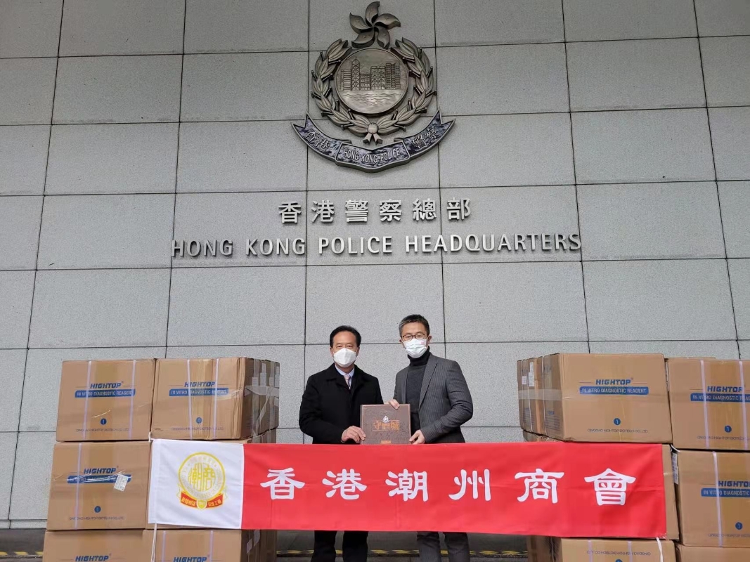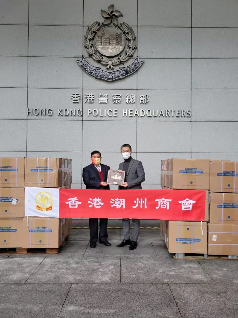 香港潮州商會捐贈前線警務人員抗疫物資,香港警務處處長蕭澤頤出席捐贈儀式(右);左為香港潮州商會常務會董、警務處“守護動物”中央咨詢委員會委員、西區耆樂警訊主席謝喜武。 香港潮州商會並向香港醫護,消防和各抗疫前線人員致以崇高敬意,感謝他們日以繼夜,不辭勞苦地照顧病患;也衷心感謝來港支援的抗疫醫療人員。在中央全力支持和指導下,在內地各有關部門和機構協力幫助下,香港政府全力以赴,香港市民和社會各界同心協力,全力投入這場史無前例的抗疫戰爭,我們相信香港一定能打贏這場抗疫戰。 【編輯:刘春】