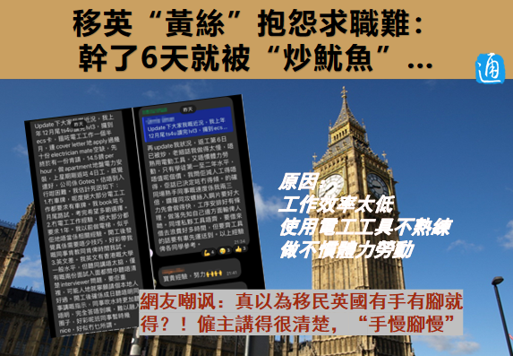 香港“黃絲”抱怨移民英國後求職難:幹了6天就被“炒魷魚”…香港新聞網2月23日電 不少香港“黃絲”對於移民英國這事兒,一直充滿幻想,以為海外是天堂,結果去到當地才發現,他們連找份工作都難過登天! 即便他們願意放下身段轉行,還有可能遇到無良僱主的壓榨,甚至毫無預兆地被“炒魷魚”…… 日前,這一殘酷的現實故事再次上演,也刺痛了不少“黃絲”的心。