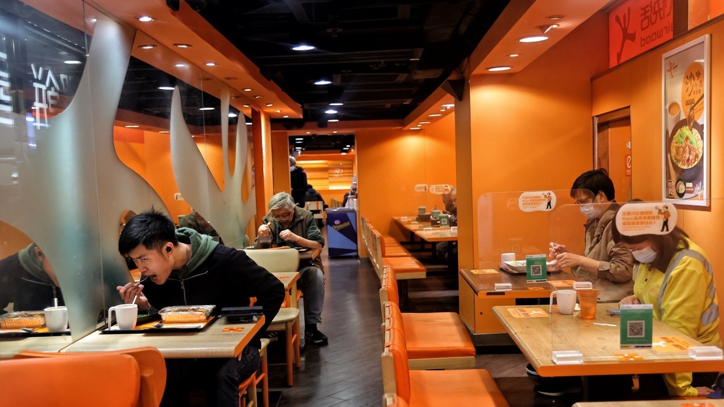 (香港中通社資料圖) 今日起,餐飲處所會進一步收緊限制每枱人數上限至二人,聯同其餘仍然獲准營運的599F章表列處所,包括商場、百貨公司、街市、超級市場等,將全面實施“疫苗通行證”。 所有進入表列處所範圍的人士均須符合疫苗接種要求,除了獲豁免情況,12歲或以上市民進入表列處所必須至少打一針,並使用“安心出行”。如市民被發現身處指明處所時不符合通行證要求或沒有掃“安心出行”,可被罰款各5000元(港幣,下同)。 此外,截至3月9日,市民在任何公眾地方,包括郊野公園,不論是否進行體能活動,均須佩戴口罩;而在公共交通工具上及港鐵已付車費區域,均一律不得脫下口罩飲食。獲授權人員可拒絕未有按規定佩戴口罩的人士登上該交通工具或進入該區域,亦可要求該人佩戴口罩及離開該交通工具或該區域。如有違法,最高可被罰款一萬元。 【編輯:刘春】