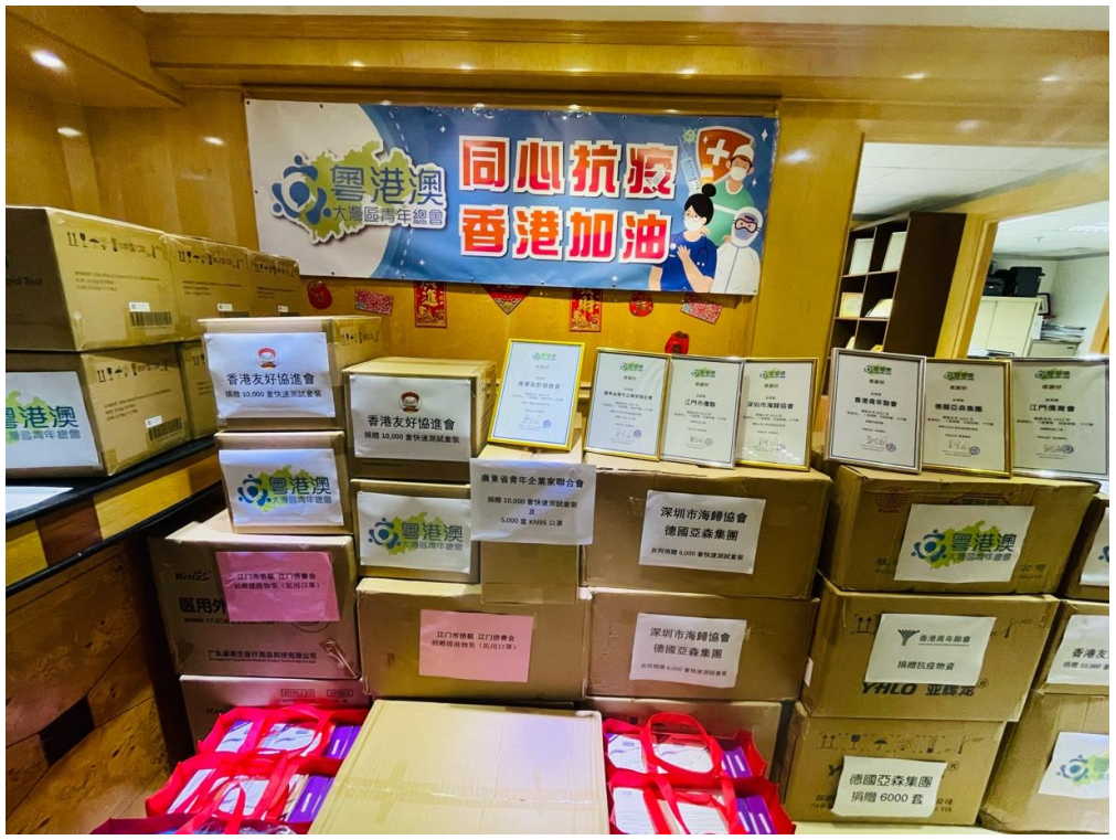 主席吳學明(中)和義工親自送抗疫物資到確診家庭手中 中央就支援香港抗擊第五波疫情,作出重要指示,強調特區政府切實負起主體責任,盡快穩控疫情,同時指示中央各有關部門及地方當局助港抗疫。 在這個非常時期,粵港澳大灣區青年總會主動肩負社會責任,發起“粵港同心,十區聯動, 抗疫送暖”大行動,主席吳學明及其他總會成員到疫情較為嚴重的地區,向確診家庭送抗疫防疫物資。活動獲得會內成員及多個團體的物資捐贈,包括廣東省青年企業家聯合會、香港友好協進會、 香港青年聯會、深圳市海歸協會、江門市僑聯江門市僑青會和德國亞森集團等等,合共捐贈逾 10 萬份抗疫物資。
