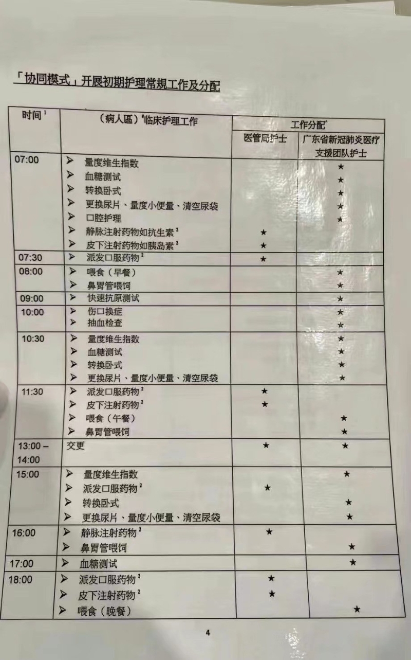 香港新聞網3月18日電 香港第五波疫情嚴峻,內地援港醫護日前到港,並開始到亞博社區治療設施照顧病人。內地社交媒體微博近日熱傳一張“協同模式開展初期護理常規工作及分配”表,據“分配表”顯示,在亞博館病人區的臨床護理工作從清晨7時開始,包括治療、護理等多個方面,其中醫管局護士主要負責靜脈注射、皮下注射、派發口服藥物等工作,內地援港醫療隊護士主要負責血糖測試、為病人轉身、更換尿片、餵食、抽血檢查等工作。