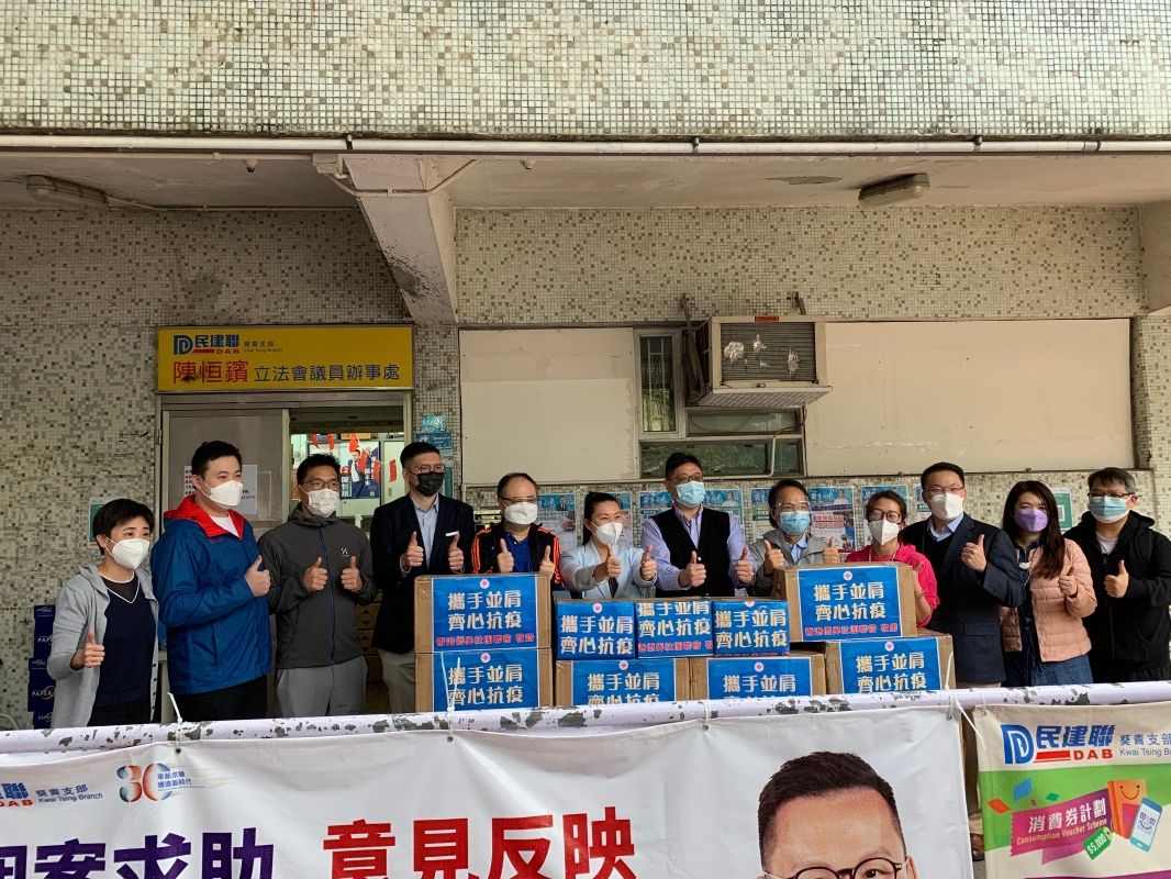 香港新聞網3月23日電 香港第五波疫情近日有所回落,社區防疫工作依舊沒有停下。香港僑界社團聯合會組織“僑青義工突擊隊”,深入社區派送防疫物資。3月23日,香港僑界社團聯會會長黃楚基、常務副會長兼秘書長廖宇軒和副會長梁日輝帶領部分“僑青義工突擊隊”成員,攜手民建聯立法會議員林琳和區議員梁嘉銘辦事處的義工,前往葵青區葵芳邨和青衣長康邨的社區,向基層街坊贈送快速抗原檢測劑3000支、酒精消毒紙巾60000片、清潔噴霧劑30樽,酒精搓手液36樽等抗疫物資。
