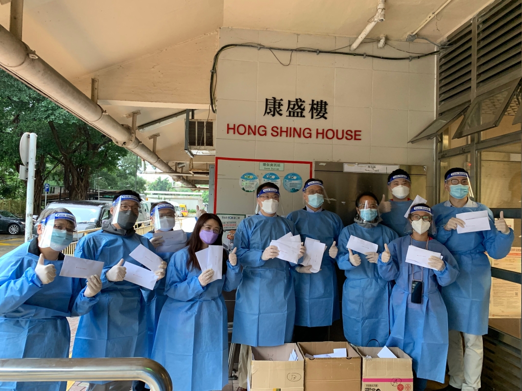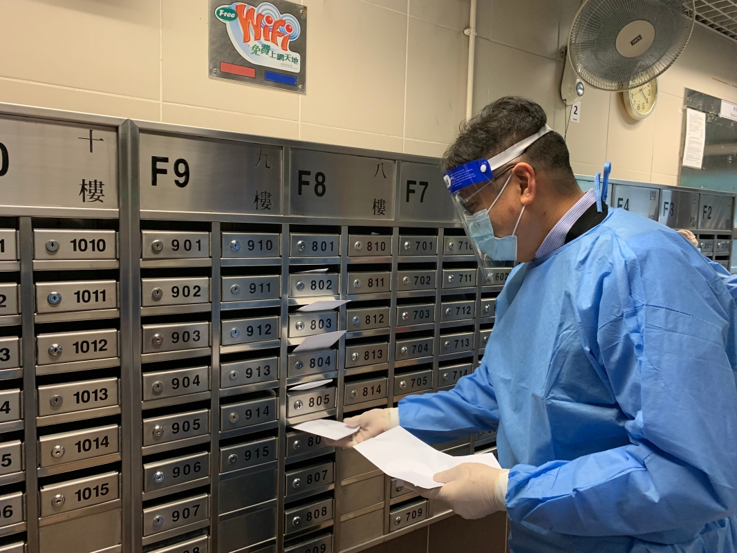 香港中通社圖片 迎著陣雨,僑青義工成員們驅車趕到位於青衣的長康邨社區。義工們有序的將物資搬運到集合地,制定好分發策略後,有條不紊的穿戴防護服、手套和防護面罩。黃楚基表示,“讓義工們穿戴防護服既可以保障他們的安全,也可以保護社區的居民。我們將防疫物資發放到有需要的社區街坊的信箱裏,也是減少大家接觸的機會”。