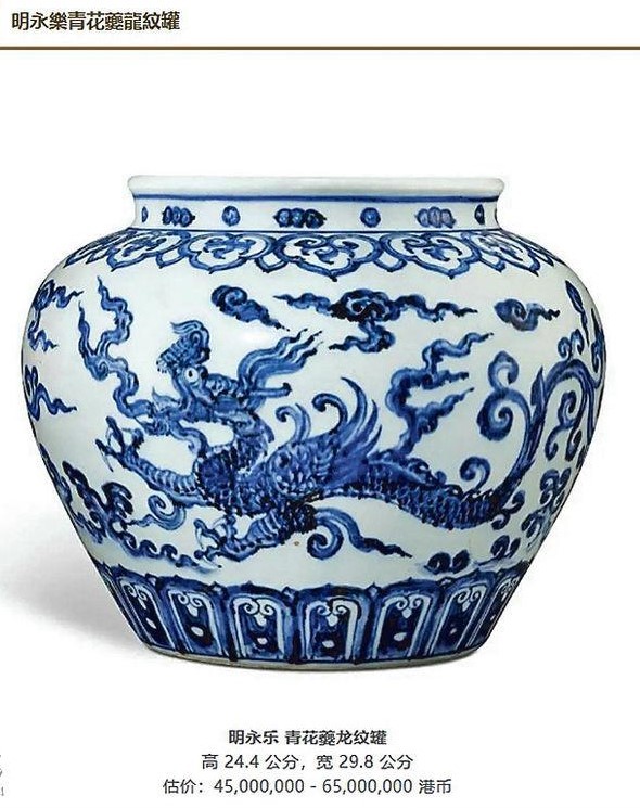 香港新聞網3月30日電 2022年蘇富比香港春季拍賣“皇苑蘊珍 — 劉鑾雄藏御瓷萃珍”專拍於2022年4月29日舉行,劉鑾雄(大劉)收藏的中國珍瓷,包括明永樂青花夔龍紋罐,估價4500萬至6500萬元(港幣,下同)。明成化青花雙龍趕珠紋盤,估價2000萬至3000萬元、清雍正粉彩過枝福壽雙全紋大盤,估價1800萬至2500萬元等。