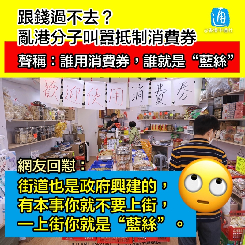 疫情期間,香港經濟民生受到影響,消費券被形容是及時雨。亂港分子為反而反,攻擊政府利民政策的舉動,隨即引發不少網友反擊。 “特區政府發放的消費券,說到底是納稅人的錢。”有網友質問,“為什麼不能用?” 也有網友回懟:“街道也是政府興建的,有本事你就不要上街,一上街你就是藍絲。”