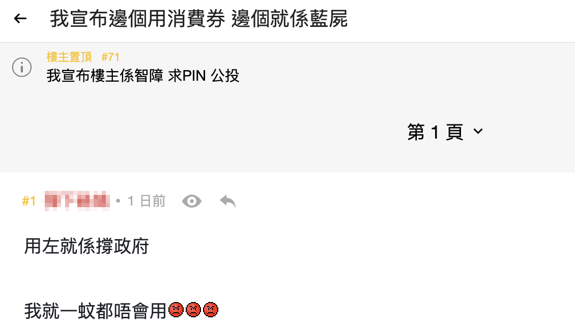 有亂港分子昨日在“連登”討論區發帖叫囂稱,誰用消費券,誰就是“藍絲(指支持政府的人士)”。由於消費券是政府派發,該亂港分子偏執地認為,誰用消費券,就代表支持政府的所有政策,還叫囂稱自己一分錢也不會用。