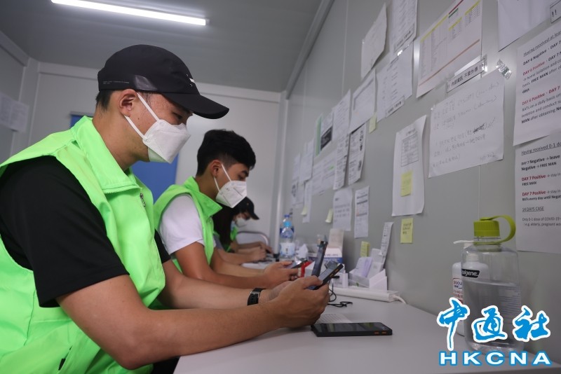 對於初入隔離設施的患者來説,生活用品往往準備得不充足的。入境處專門設立電話熱綫和物資管理處,以便滿足患者的物資需要。 負責方艙物資部運作的何烱麟負責方艙醫院之間的物資調配、隔離間的物品補給等。他特別提到,老人、小孩、女性都會有特殊的物品需求。比如,出生不到三個月的嬰兒需要準備尿片;會給小朋友提供玩具、書籍;給老人家提供輪椅;也會給女性提供衛生用品等。甚至有患者半夜想吃泡麵,也會在最短時間將泡麵送到他們手上。 電話熱線疏導隔離情緒 “我們物資部,最重要的角色是提供患者日常生活所需,讓他們很安心地在這裡休養,完成隔離期重回社區,這是我們最想做的事情。” 隔離人士可通過熱綫中心提出自己的需求,中心工作人員再轉告物資部。熱綫中心還擔任了“心靈輔導員的角色”,記者當日到訪時,電話熱綫組小小的辦公室坐滿了工作人員,人手2、3部手機,有的在用whatsapp或短訊跟病人溝通物資需要,有的在打電話疏導病人情緒。