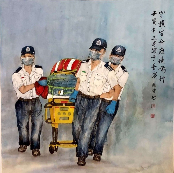 據介紹,此批作品有以下特點:一是題材廣泛,呈現多樣化,除反映醫護人員抗疫一線工作外,還配合中央援港的多方面題材,畫家加大這方面的創作。