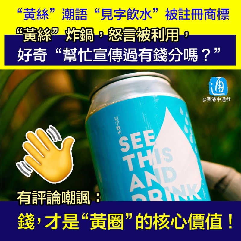 香港新聞網4月13日電 香港“修例風波”期間,“黃絲”們經常掛在口邊的“見字飲水”,原來早已被“黃圈”嗅出了錢味,於2020年被註冊成商標。 近日有香港廣告商使用“見字飲水”一詞作廣告,被“見字飲水協會”以該詞已註冊商標為由,要求徵收費用。這一做法讓“黃絲”們炸鍋了,直斥協會利用他們,又好奇 “宣傳過這四個字的有錢分嗎?”有評論則一針見血地嘲諷稱,“黃圈”就是見錢眼開!