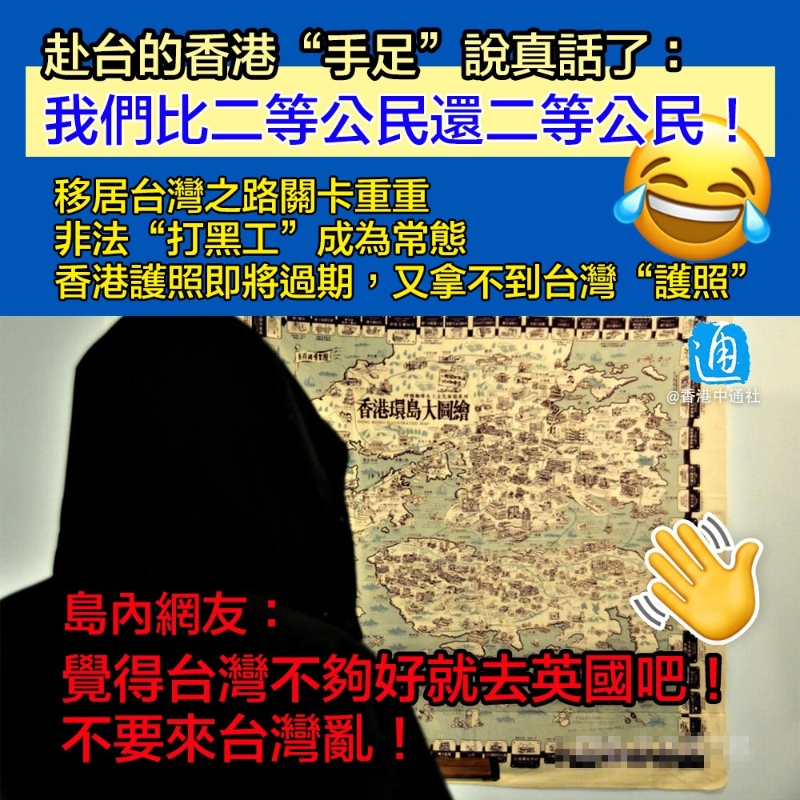 據台灣“中央社”報道,台當局並未在法律上認定這些赴台港人為所謂的“政治難民” ,因此他們只能走一般港人移居的路。然而,多數赴台的香港“手足”是年輕學生,受限於財力等,難以投資、專業人才方式移居台灣。因此,逾百名香港“手足”多藉就學、就業方式,隱身於在台港人群體中。 特殊的身份和處境,讓他們難以在台灣真正地安身立命。回不了香港,又不知能否獲得台灣身份證,亦讓他們焦慮不安。 依台灣法規,以就業方式在台居留的港人,最終無法申請定居。因此,據報道,在香港已大學畢業且工作幾年的阿K(化名),竄逃台灣後只能選擇入讀台灣的大學,成為超齡學生。但要最終獲得定居權,阿K還要面對重重難關。 據悉,阿K畢業後必須留台工作5年,而受僱公司的資本額、營業額都有門檻。5年後,阿K每月收入要超過基本工資2倍(新台幣5萬500元)門檻,才有申請定居的資格。 這意味著,像阿K這樣的超齡學生,要再苦等9年、人到中年時,才有機會拿到台灣定居權。而高懸的薪資門檻,也讓就讀文科的阿K感到不安。 除了前途未卜,竄逃台灣的“手足”亦面臨生計困難。 按規定,在台港生每週打工時數不可超過20小時。對此,阿K直言,有關收入根本不足以支付學費和生活開支。因此,非法“打黑工”成為阿K這些竄逃台灣的“手足”的常態。 隨之而來的,就是各種勞動糾紛。阿K指出,不少“手足”都遇過被拖欠工資、同工不同酬,甚至性騷擾等問題。他們曾向台當局求助,但經常投訴無門。 此外,多數“手足”還面臨香港護照在這幾年過期的尷尬處境。做賊心虛的他們已不可能回港換新護照,但又拿不到台灣“護照”……這讓他們不僅無法隨意移動,連在台灣租屋、銀行開戶也面臨困難。 種種困境讓阿K相當灰心,埋怨稱,“這讓我覺得,我們比二等公民還二等公民!” 針對居台的香港“手足”面臨的困境,有台灣民間團體提議台當局為這批人“開綠燈”、進行政策鬆綁。不過隨即引發廣大台灣民眾的反感。 “憑什麼要給香港人特權?”有島內網友態度堅決地說:“因為是香港人就任意鬆綁規定,那對其他國家及地區的人不公平,也亂了台灣的政策!想移居可以,照規矩來!” 有網友則奉勸“香港人別一天到晚要特權”,移居本來就很辛苦,“不要試圖干涉台灣政策,台灣不是收破爛的!”