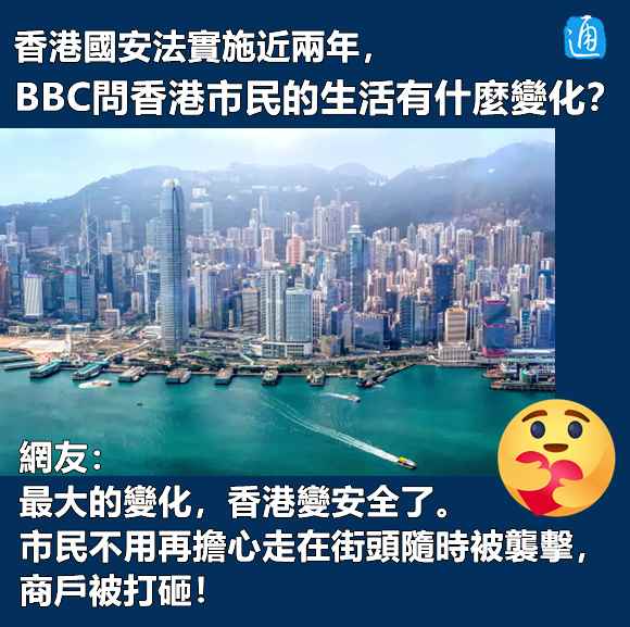 香港新聞網5月25日電 香港國安法實施即將滿兩周年之際,英國BBC突然“關心”起香港市民,詢問這兩年“香港市民的生活有什麽變化?”,結果被網友一眼看穿——“又想帶節奏污蔑國安法”。 然而,這波節奏已經帶不動了。許多網友留言表示:“最大的變化,是香港變安全了。”