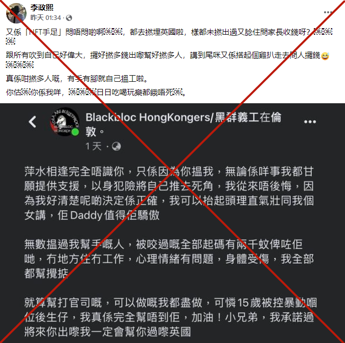 前“熱血公民”成員李政熙踢爆“黑群義工” 上周五(6月3日),“黑群義工”在臉書上發“小作文”,聲稱自己為了“同路人”又是出錢又是出力,“無論是什麼事都甘願提供支援”,甚至不惜“以身犯險”。文末還特意貼了張寫著“協助保釋人士離開香港屬於違法”的圖片,進一步鞏固自己為“手足”兩肋插刀的“有情有義”人設。 結果被竄台的前“熱血公民”成員李政熙不留情面地踢爆,稱對方都跑路到英國了,至今臉都不露一下,就又想著伸手要錢。他還說,“黑群義工”把自己吹得這麼偉大,拿出很多錢來幫了很多人,說到底還不是搞眾籌找人要錢。 然而,李政熙踢爆“黑群義工”也未必就是良心發現。 李政熙同樣是一名吃“手足”人血饅頭的“愛好者”。他曾是暴徒物資店“國難五金”的負責人,在“修例風波”期間高價向黑暴分子出售頭盔、防毒面具等物資,賺得“盆滿鉢滿”後,這才於2021年4月跑路到台灣。 和李政熙比,“黑群義工”吃起“手足”人血饅頭來一點也不遜色,以“幫手足”為名的斂財業務,更是在“修例風波”期間便已經“上線”。 有報道稱,“修例風波”期間,“黑群義工”除了不停煽“暴”煽“獨”,還頻頻以“幫助手足”的名義發起眾籌。雖自稱“絕不食人血不要光環,做實事幫手足”,但“黑群義工”不時被圈內踢爆假藉“手足”之名斂財,為此還與“手足”在社交媒體上“撕逼”不斷。 2021年8月,“黑群義工”曾聲稱要幫“被控25項煽動罪”的伍姓“手足”眾籌律師費,隨後就被該名“手足”的親屬“打臉”。該名親屬表示,沒有委託任何人眾籌律師費,并提醒其他人當心受騙。 對於李政熙和“黑群義工”這出“狗咬狗骨”的大戲,有網友表示,“他們內訌不過是為了爭利益,從來沒有良心的成分在裡面。” 也難怪早有網友揶揄:“時‘伐’革命,騙錢最勁!”