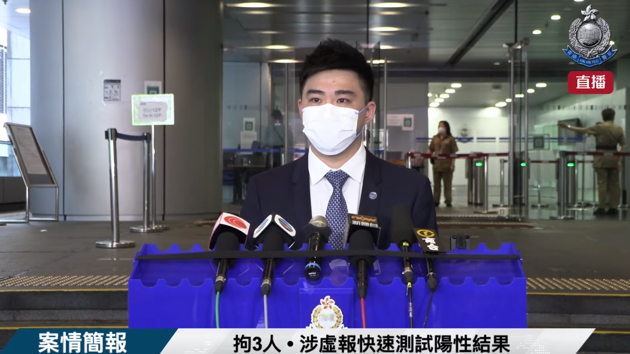 直播截圖 網絡安全及科技罪案調查科總督察鄭澤仁表示,被捕人士於今年3月及4月,分別上載不屬於自己的快測陽性結果證明,包括從網上下載快測陽性截圖,或上載過往的快測陽性結果,企圖以此獲衞生署發出隔離令;其中38歲任職救護員的男子,涉嫌申報虛假的快測陽性結果以獲取康復紀錄二維碼,另涉一項欺詐罪。 警方指,衞生防護中心至今轉介了5宗同類案件,暫共拘捕6名人士,包括昨日拘捕的3人,警方強調不排除有更多人士被捕。 【編輯:张琦】
