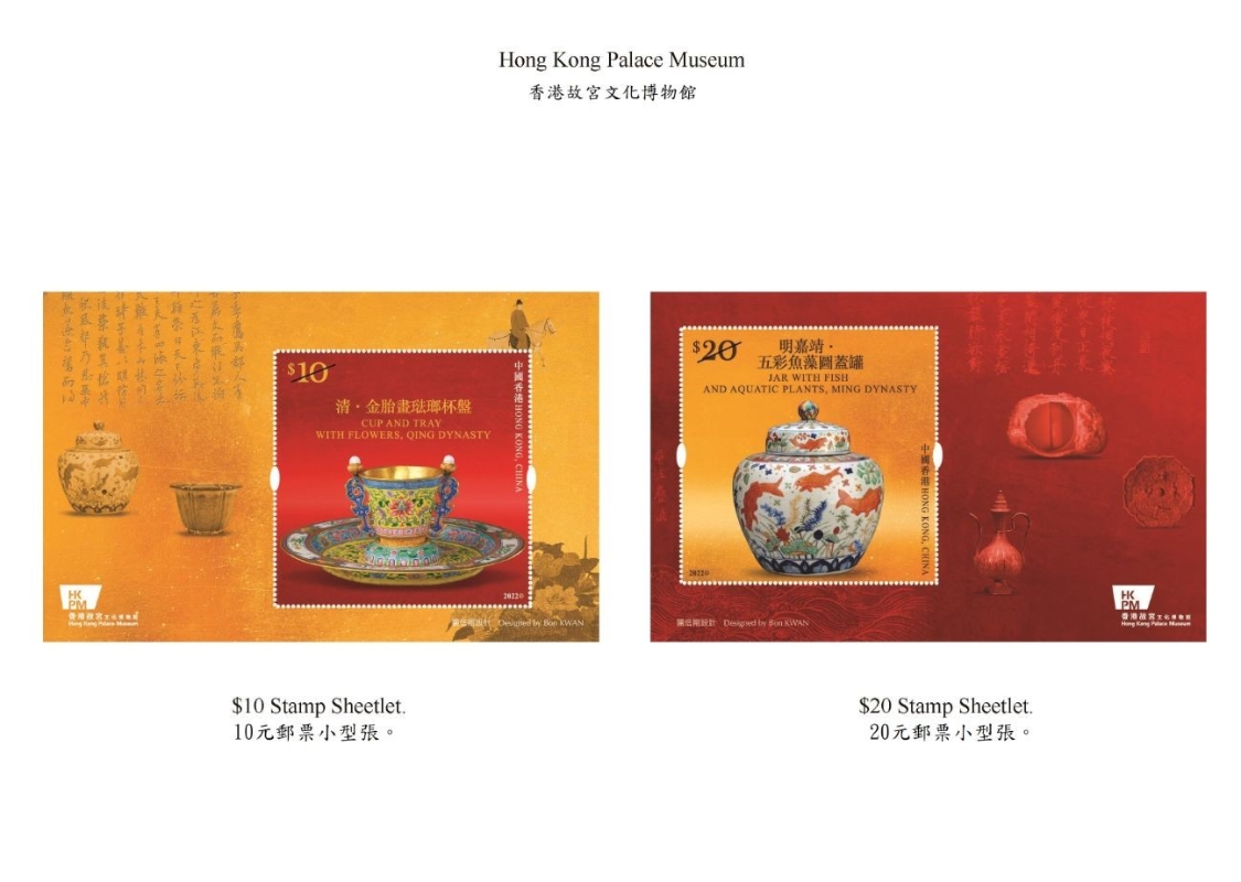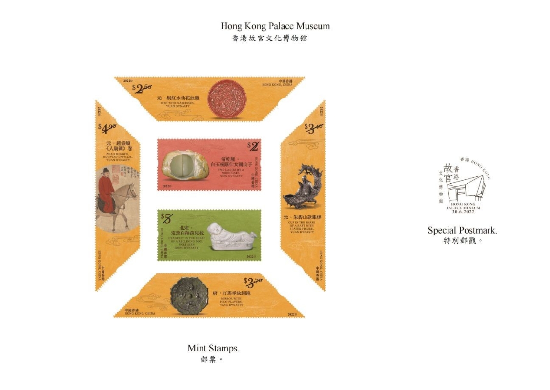 香港新聞網6月15日電 香港郵政6月15日宣布,以“香港故宮文化博物館”為題的特別郵票及相關郵品6月30日(星期四)推出發售。 香港故宮文化博物館以嶄新的策展手法,從香港角度出發,結合環球視野,展出故宮博物院及其他重要文化機構的珍藏。香港郵政以“香港故宮文化博物館”為題,發行一套六枚郵票及兩款郵票小型張,展示故宮博物院的珍藏文物,體現中華文明的博大精深,並推動公眾對國家藝術和文化的研究和欣賞。 是次發行的一套六枚郵票,以“天圓地方”為基礎設計概念,每枚郵票分別以幾何圖案展示藏品,當中包括“清乾隆.白玉桐蔭仕女圖山子”、“元.剔紅水仙花紋盤”、“元.朱碧山款銀槎”、“唐.打馬球紋銅鏡”、“元.趙孟頫《人騎圖》卷”及“北宋.定窯白釉孩兒枕”,而六枚郵票亦巧妙地組合成一個正方形。郵票小型張則分別展示“清.金胎畫琺瑯杯盤”及“明嘉靖.五彩魚藻圖蓋罐”,並以金黃色及朱紅色互相襯托。金黃色凸顯故宮的尊榮及輝煌歷史,朱紅色則代表了故宮的紅牆,令郵品意涵豐富,更具收藏價值。(香港政府新聞處圖片)
