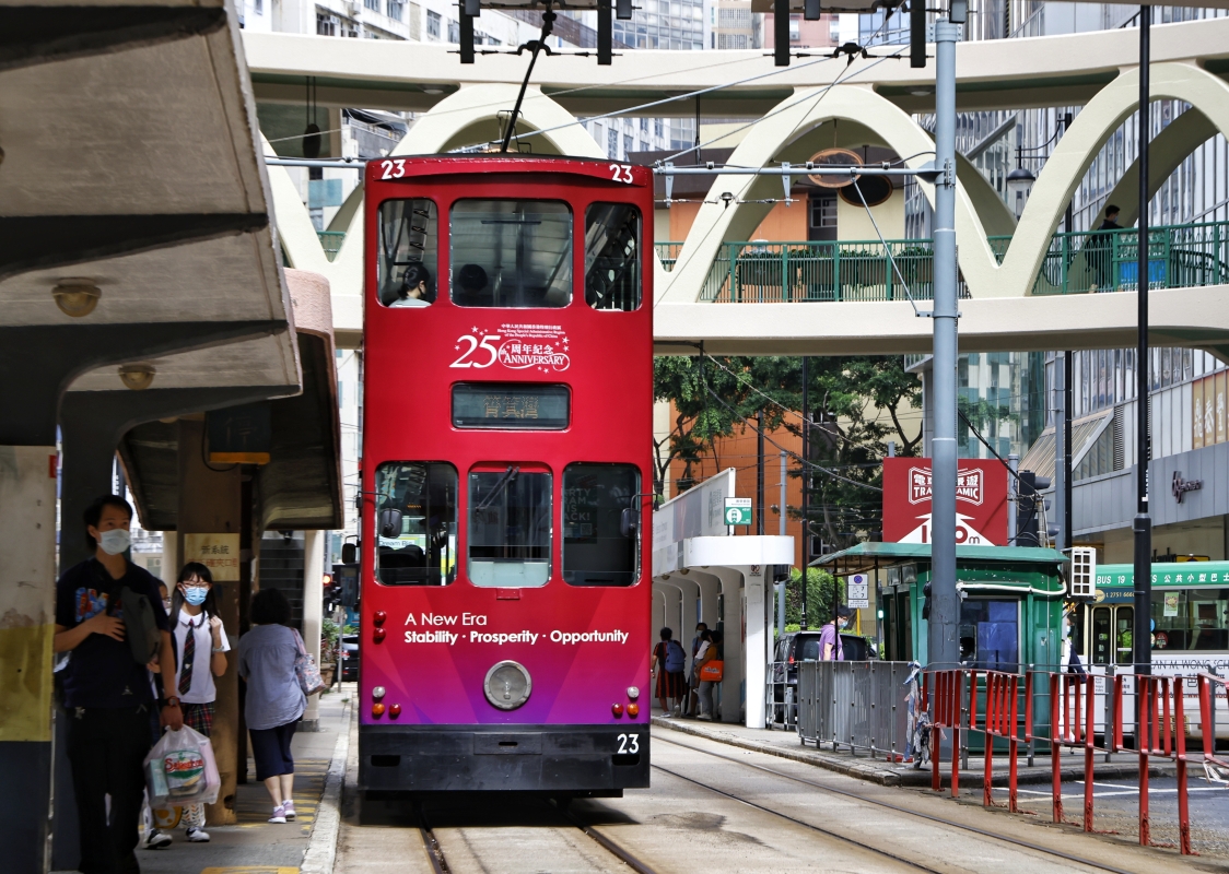 銅鑼灣多地貼出慶回歸標語。 行走在馬路中央,巴士、小巴、電車皆“換新裝”,穿上了慶祝香港回歸祖國25周年的外衣,連平日里緩慢行駛的電車都穿梭出紅火動感。 6月至8月期間,屈地街電車廠至跑馬地總站來回,新巴、城巴各條線路以及銅鑼灣線上多輛小巴都張貼上了慶回歸的車身廣告,且為慶祝回歸,7月1日香港市民可免費乘搭電車,多輛專線小巴亦為市民提供免費服務。