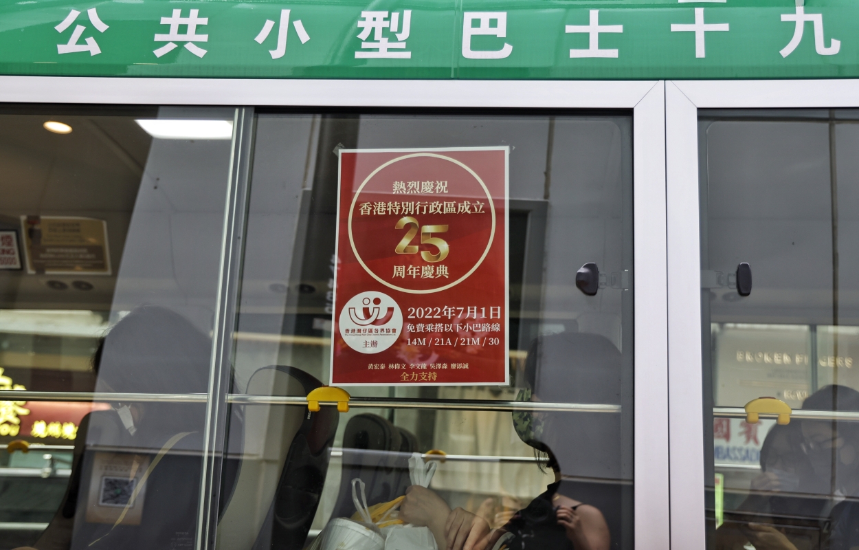 新巴、城巴各條線路都有慶回歸廣告巴士。 香港各區,抬頭即可見各式插掛彩旗、橫幅,旗海飄洋。穿梭在一片紅海中,港人腳步輕快,迎風而來。