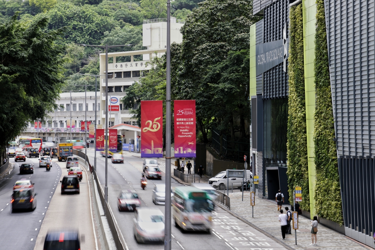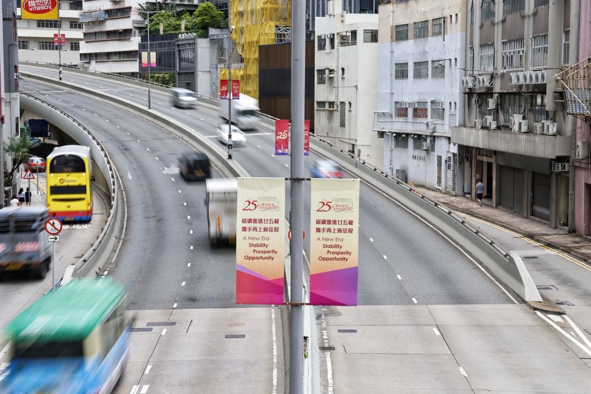 香港各區旗海飄洋。 2022年7月1日對於香港來說意義非凡,這一天,既是香港回歸祖國25周年的紀念日,也是新一屆特區政府履新的日子。近日,政府總部周圍圍繞大量慶回歸橫幅、彩旗。