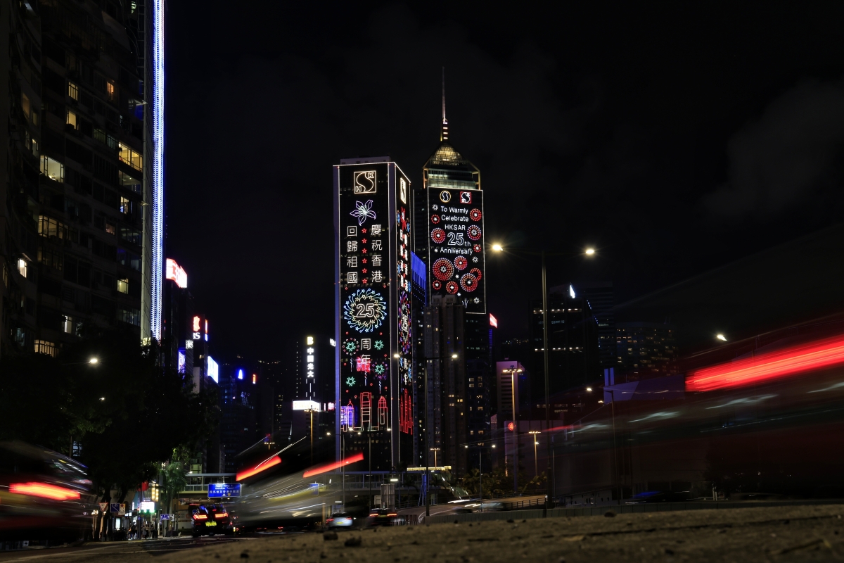 政府總部外。 夜幕降臨,回歸熱切不減。街頭巷尾更現一新,各類五彩斑斕的回歸燈飾,讓萬家走入燈火。