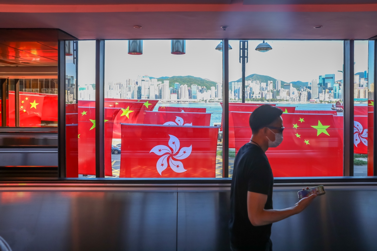 逾百面國旗及區旗掛滿尖東街頭。( 謝光磊 攝)