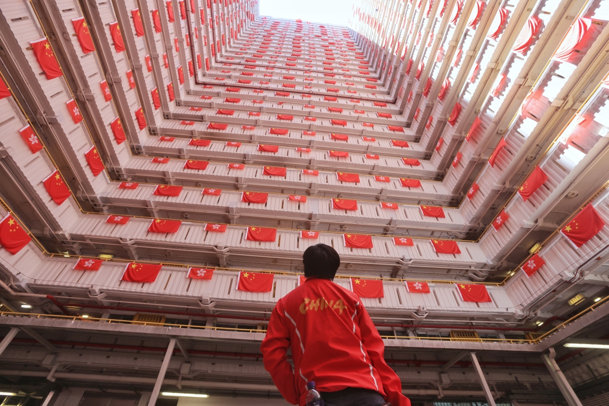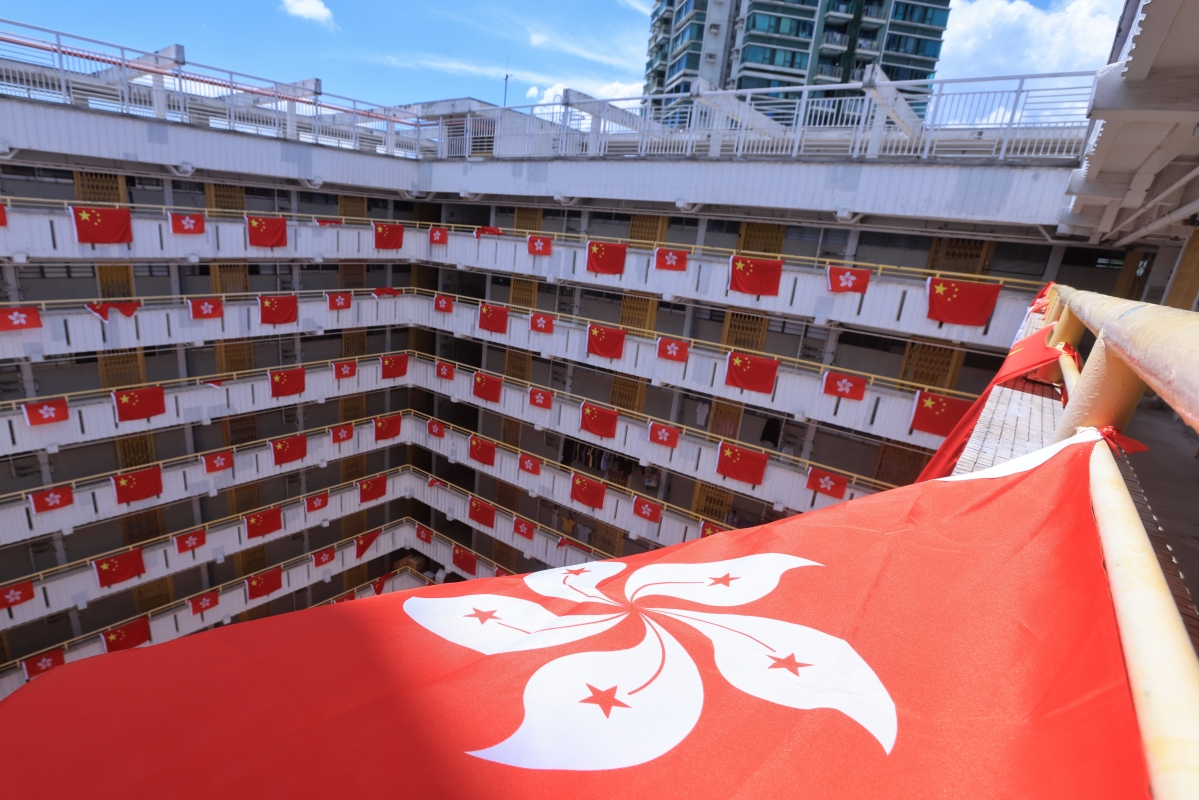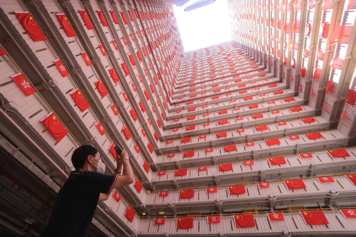 香港新聞網6月25日電 近日,香港全城裝飾一新慶祝回歸祖國25周年,6月25日,觀塘坪石邨金石樓天井掛滿中華人民共和國國旗和香港特區區旗,鮮紅色的“旗海”迎風飄揚,吸引了不少市民前來打卡。