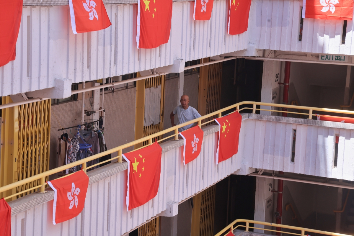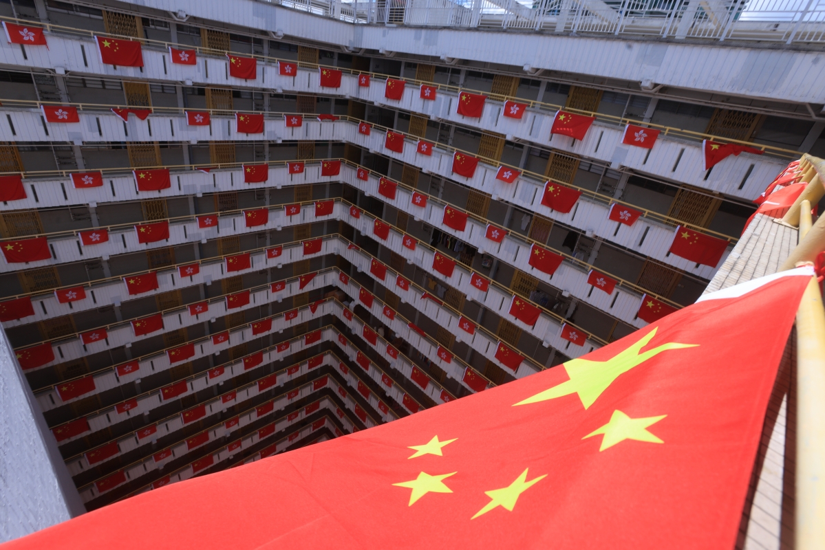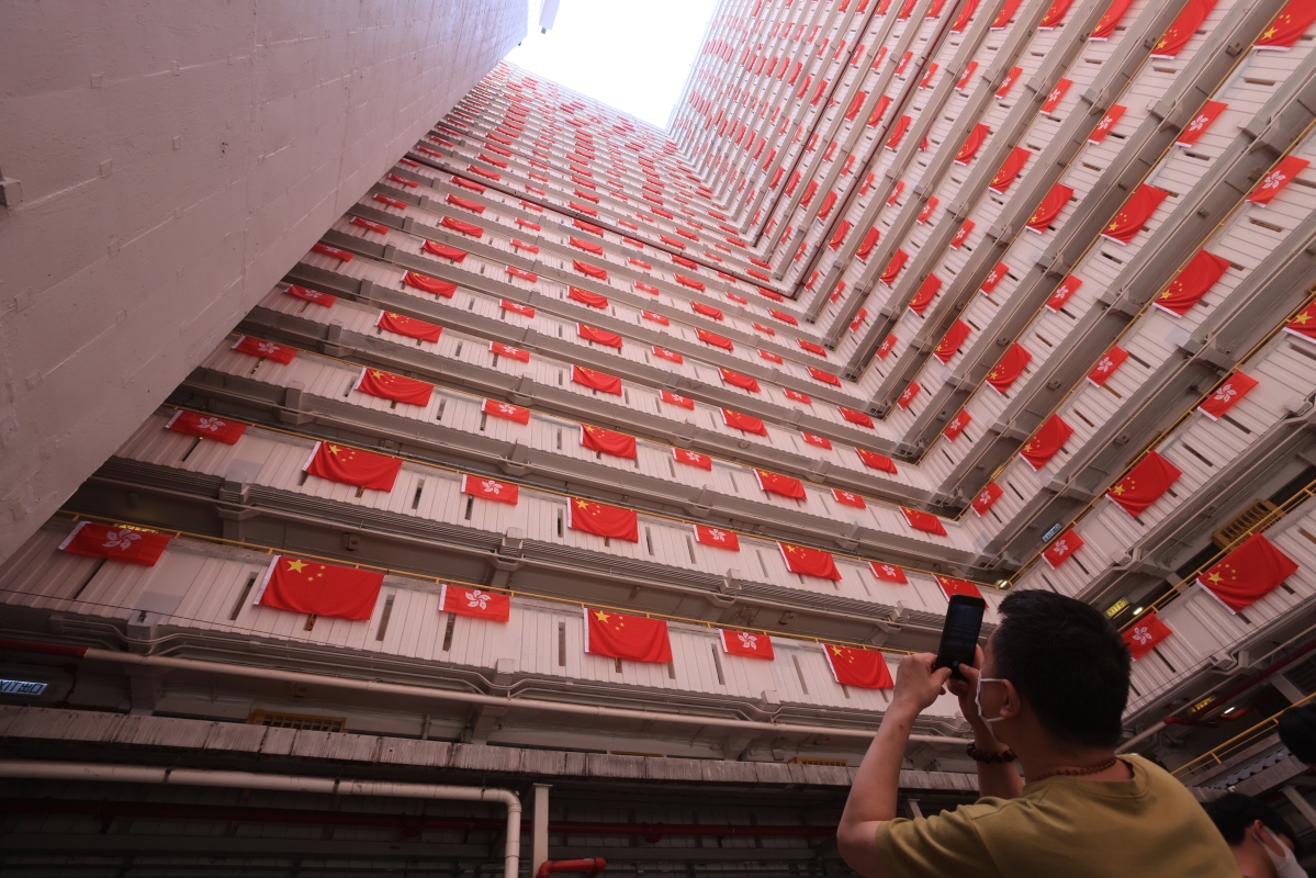 在觀塘坪石村,居民在天井掛滿國旗和區旗,大廈化身成一片“旗海”。 【編輯:許其皓】
