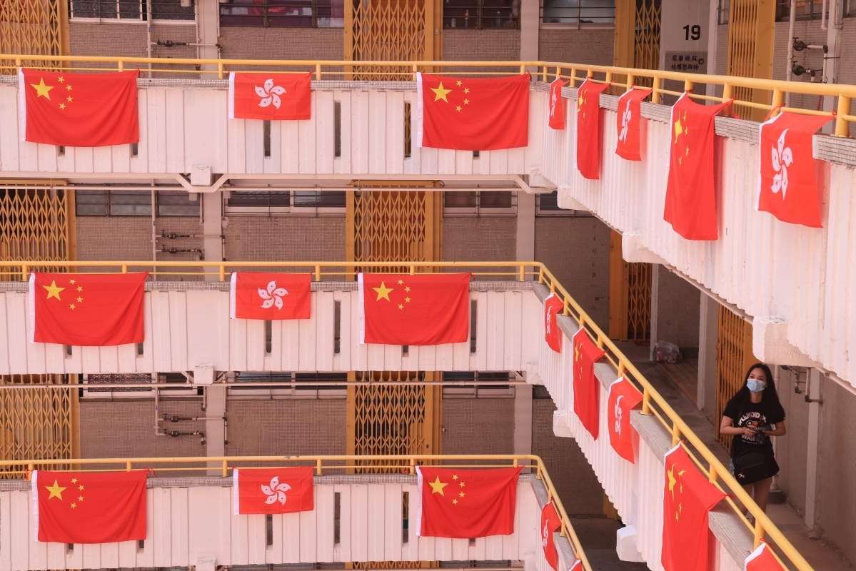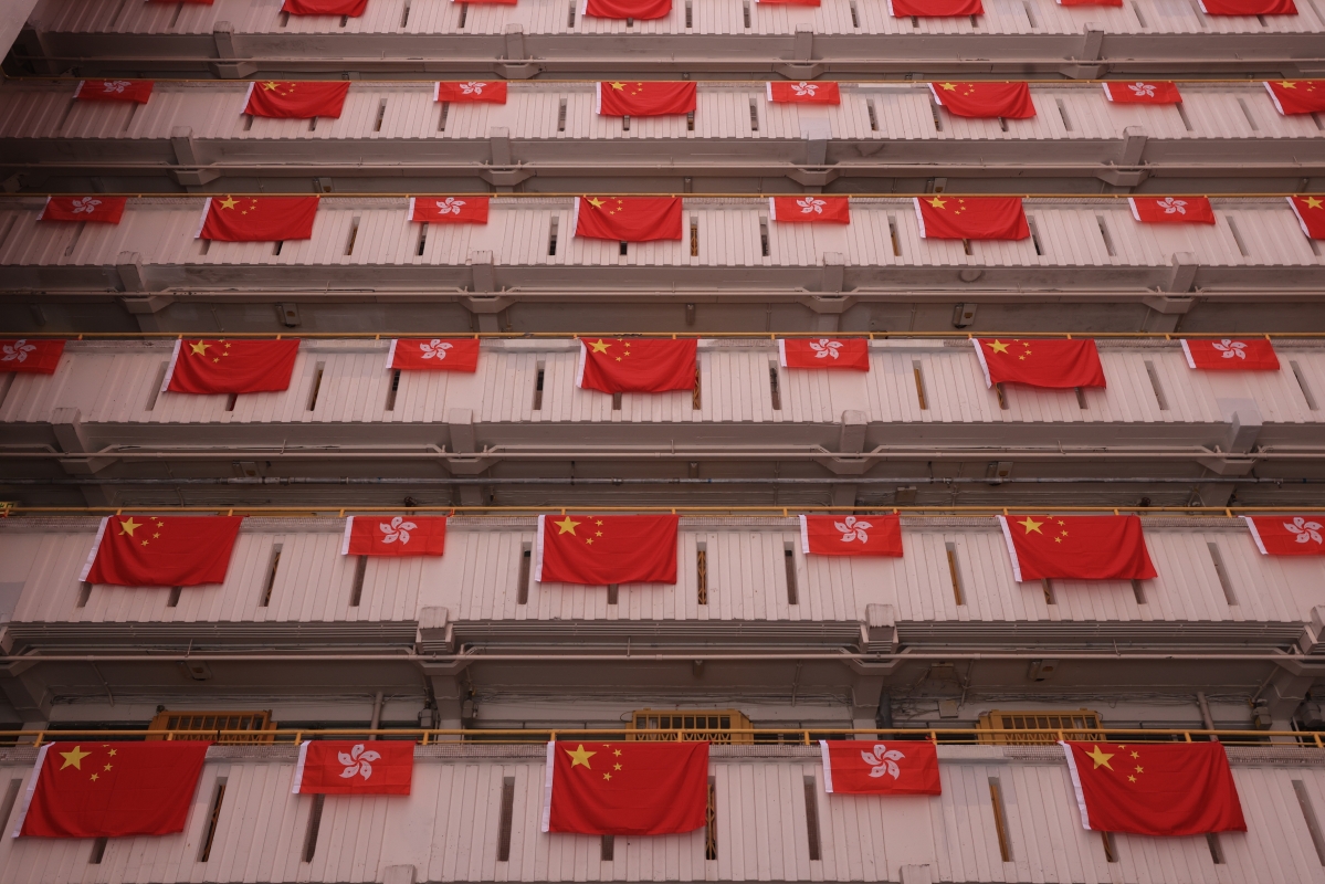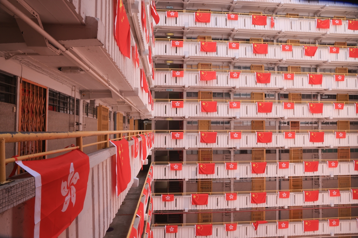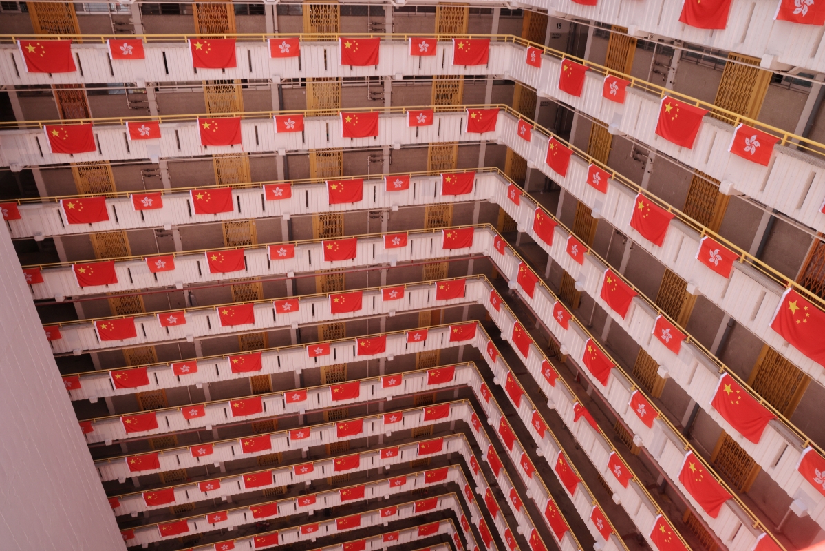 在觀塘坪石村,居民在天井掛滿國旗和區旗,大廈化身成一片“旗海”。 【編輯:許其皓】