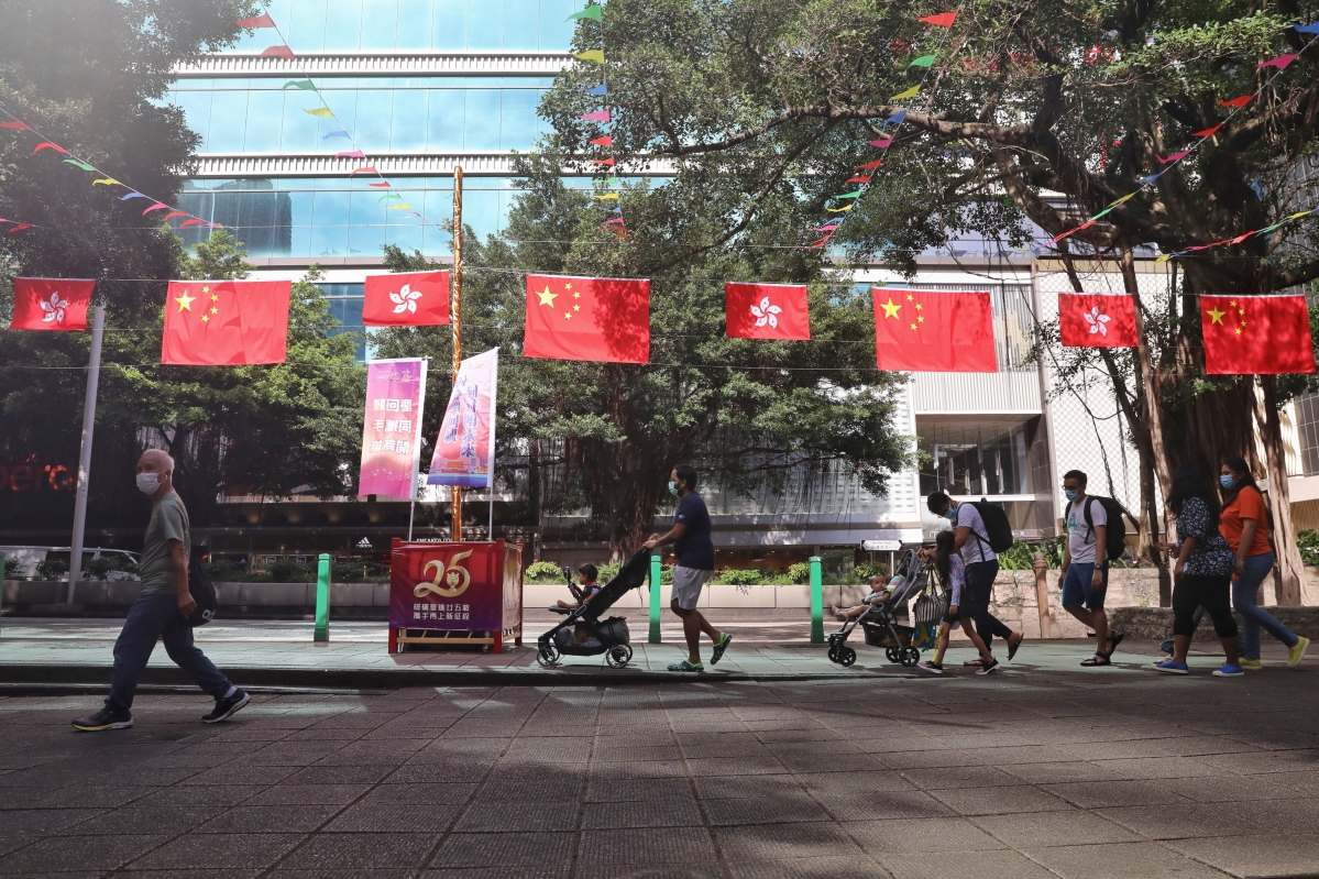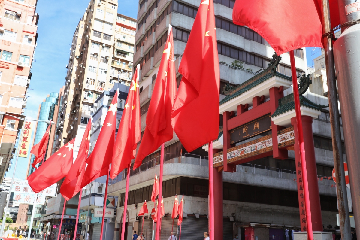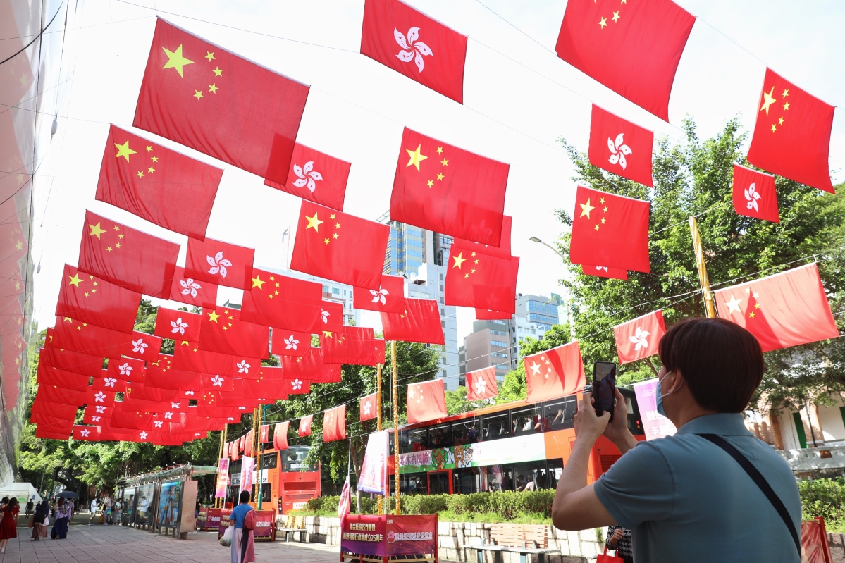 香港新聞網6月26日電 近日,香港全城裝飾一新慶祝回歸祖國25周年,6月26日,香港油麻地及尖沙咀彌敦道等核心商業區掛滿中華人民共和國國旗和香港特區區旗,鮮紅色的“旗海”吸引不少市民前來打卡。